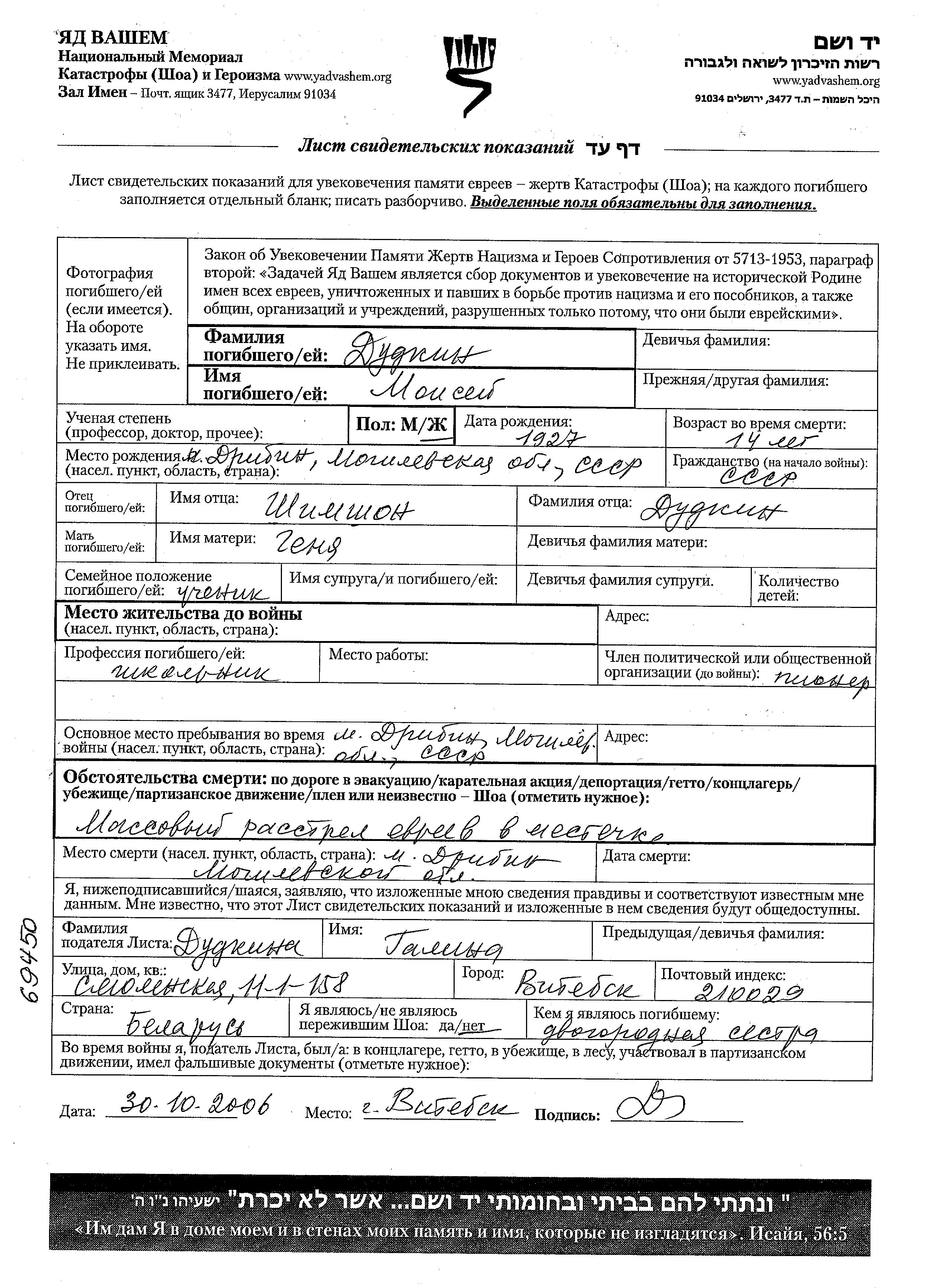 Dudkin Moisei 1927 Dribin, Belorussia (USSR) Page of Testimony