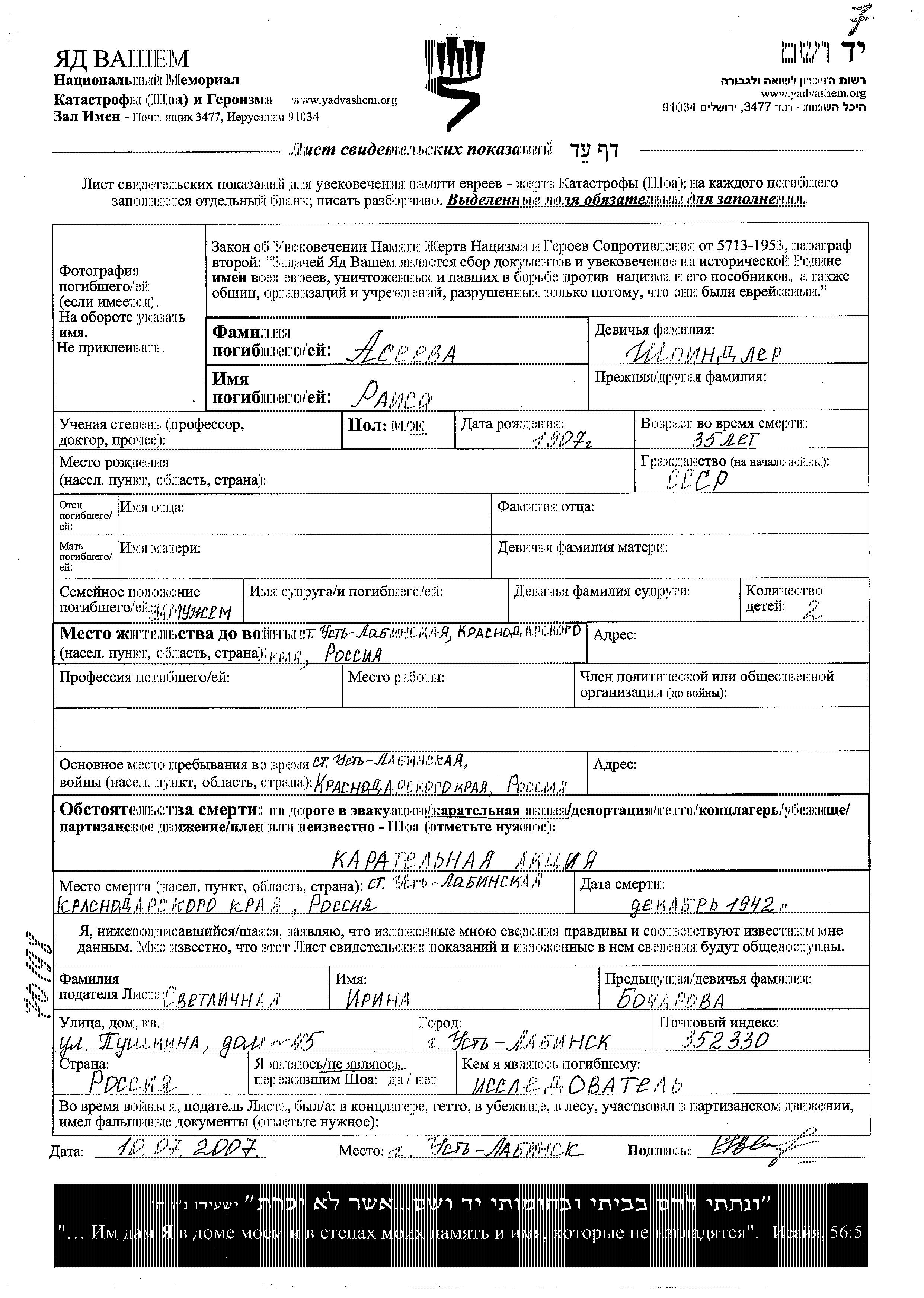 Raisa Aseyeva nee Shpindler was born, 1907. She was married. Prior to WWII she lived in Ust Labinskaya, Russia (USSR). During the war she was in Ust Labinskaya, Russia (USSR). Raisa was murdered in the Shoah. Place of death: Ust Labinskaya, Russia (USSR), 12/1942.