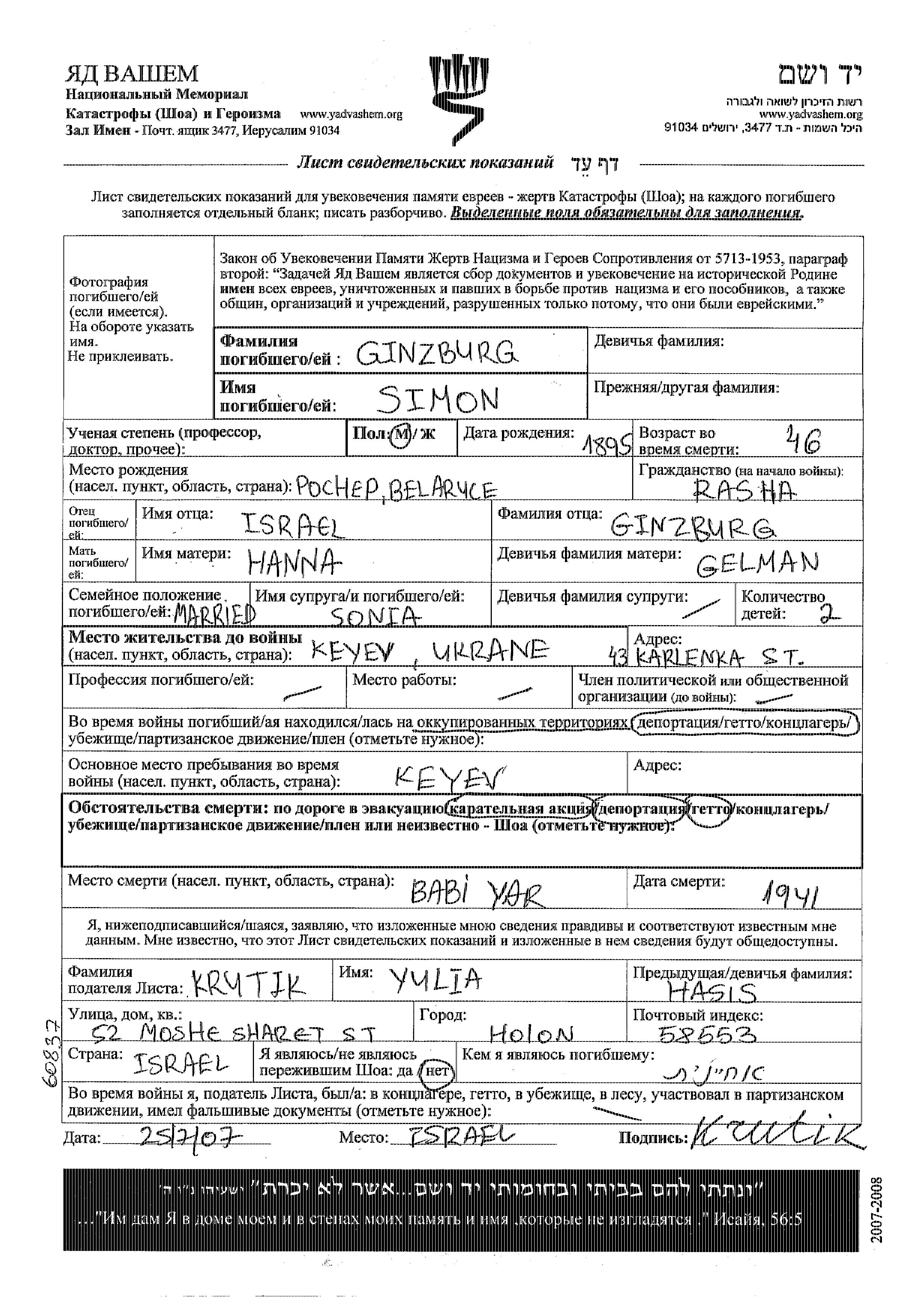 Ginzburg Simon 1895 Kiyev, Ukraine (USSR) Page of Testimony