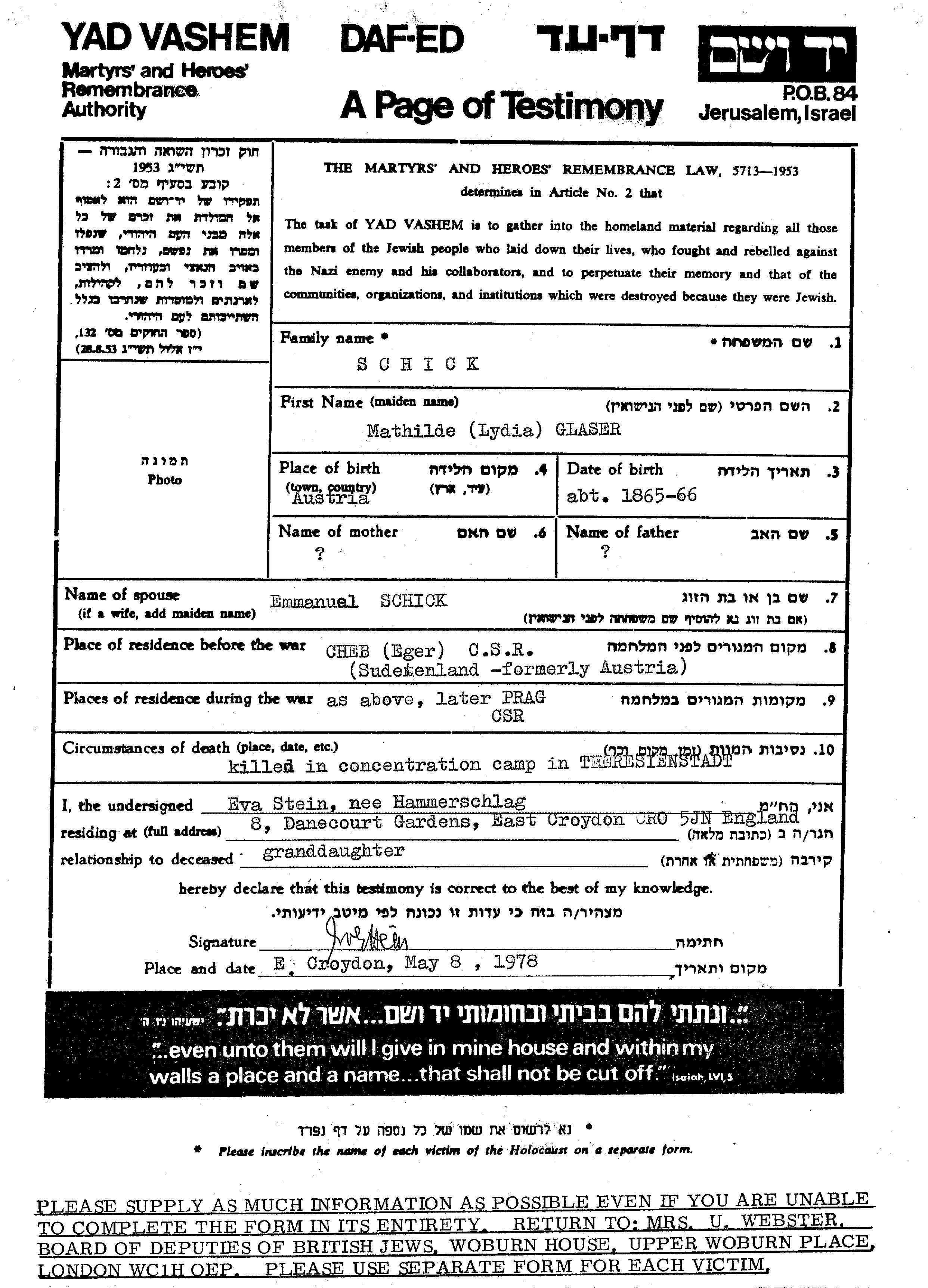 Mathilde Lydia Schick nee Glaser was born in Austria, 1865. She was married to Emmanuel. Prior to WWII she lived in Cheb, Czechoslovakia. During the war she was in Prague, Czechoslovakia. Mathilde Lydia was murdered in the Shoah. Place of death: Theresienstadt, Czechoslovakia.