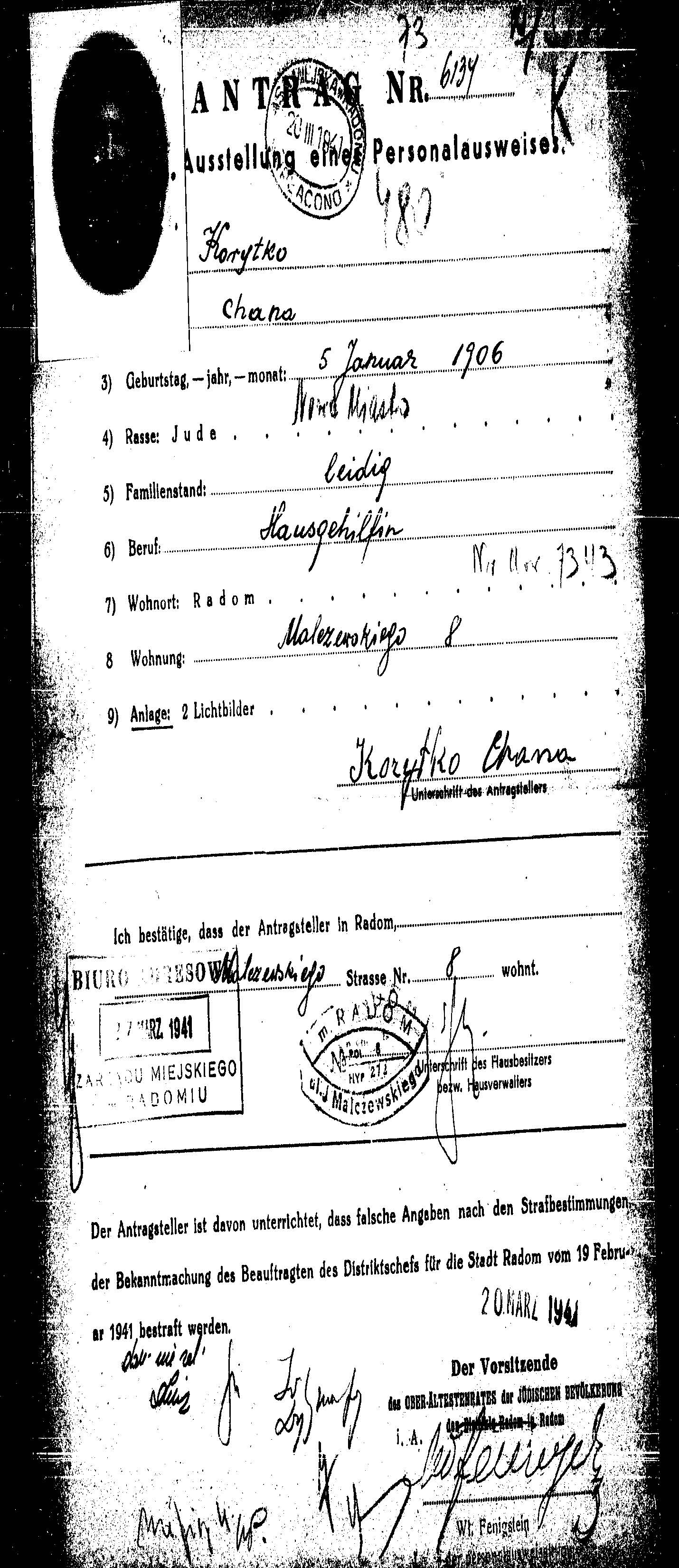 Chana Korytko was born in Nowe Miasto nad Pilica, Poland, 1906. She was a household help and single. Prior to WWII she lived in Radom, Poland. During the war she was in Radom, Poland. Chana Probably murdered the Shoah.