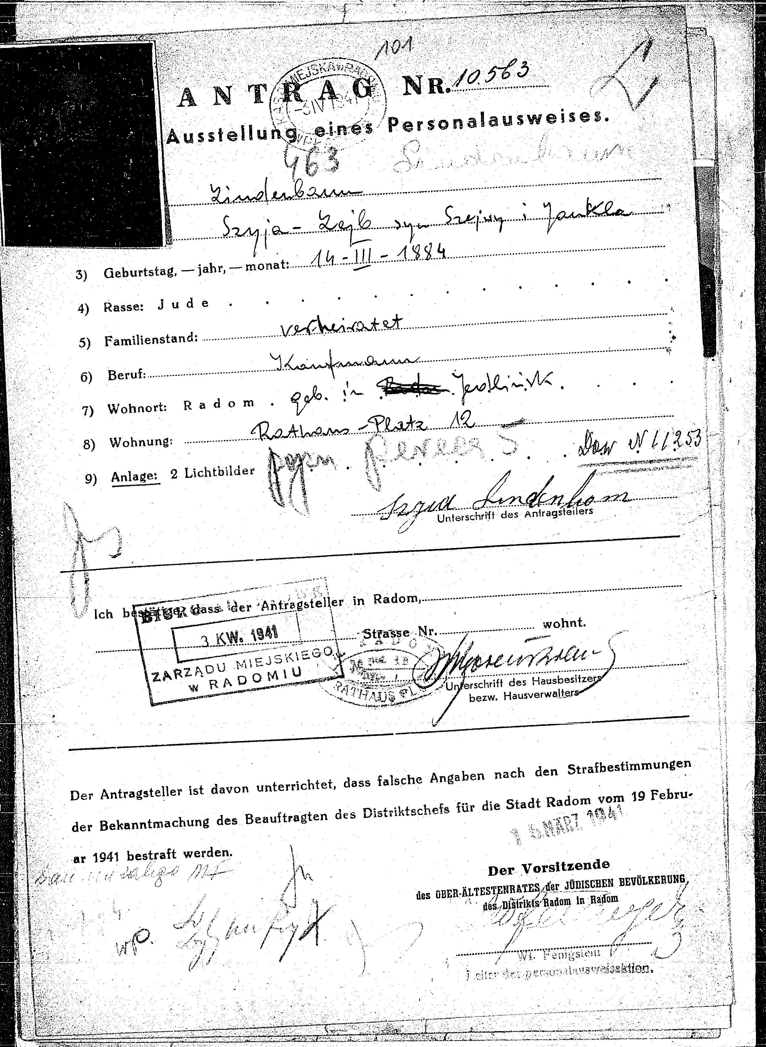 Szyja Lejb Lindenbaum was born in Jedlinsk, Poland, 1884 to Jankl and Szejwa. He was a merchant and married. Prior to WWII he lived in Radom, Poland. During the war he was in Radom, Poland. Szyja Lejb Probably murdered the Shoah.