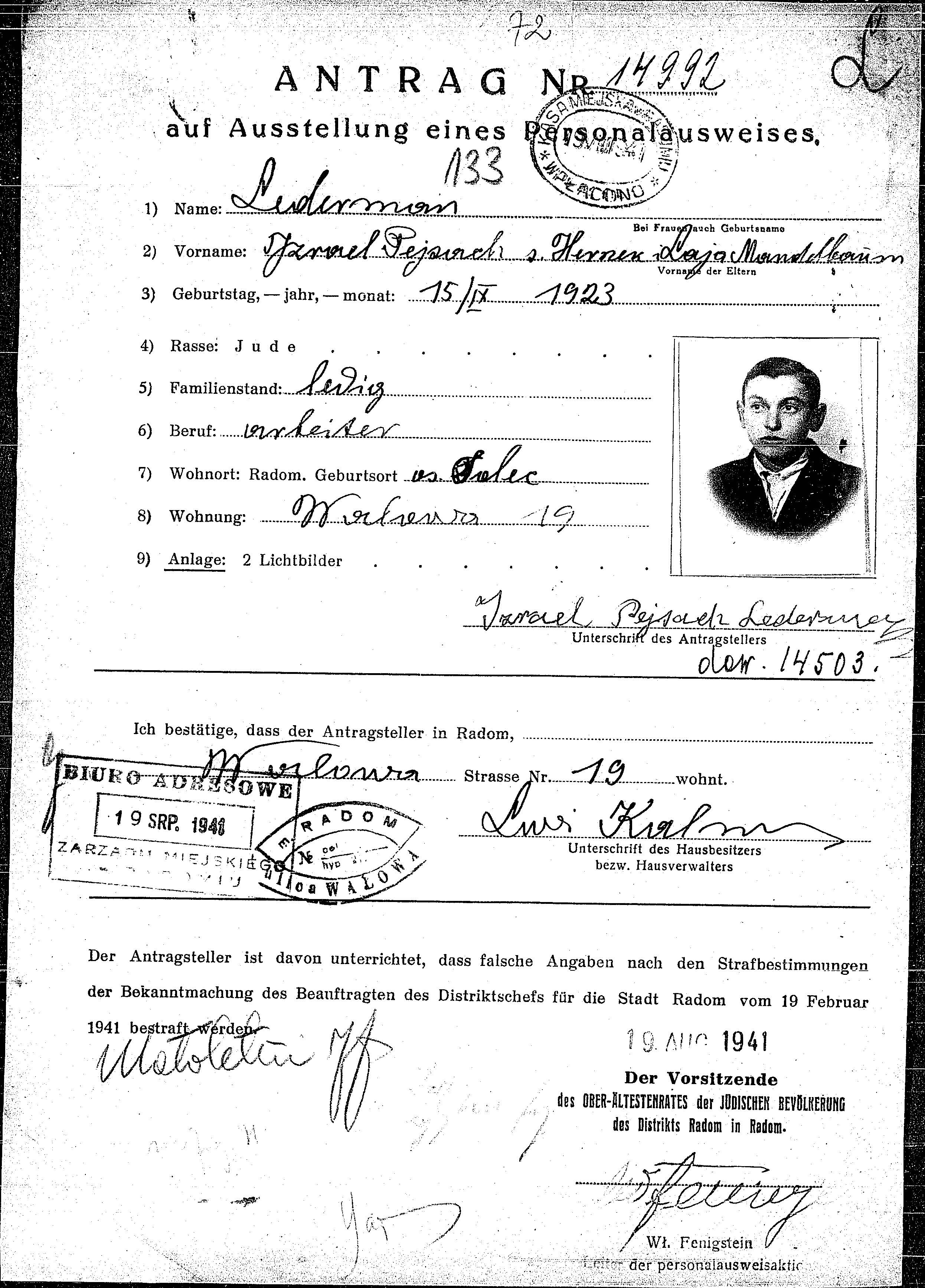 Izrael Pejsach Lederman was born in Solec nad Wisla, Poland, 1923 to Herszek and Laja nee Mandelbaum. He was a worker and single. Prior to WWII he lived in Radom, Poland. During the war he was in Radom, Poland. Izrael Pejsach Probably murdered the Shoah.
