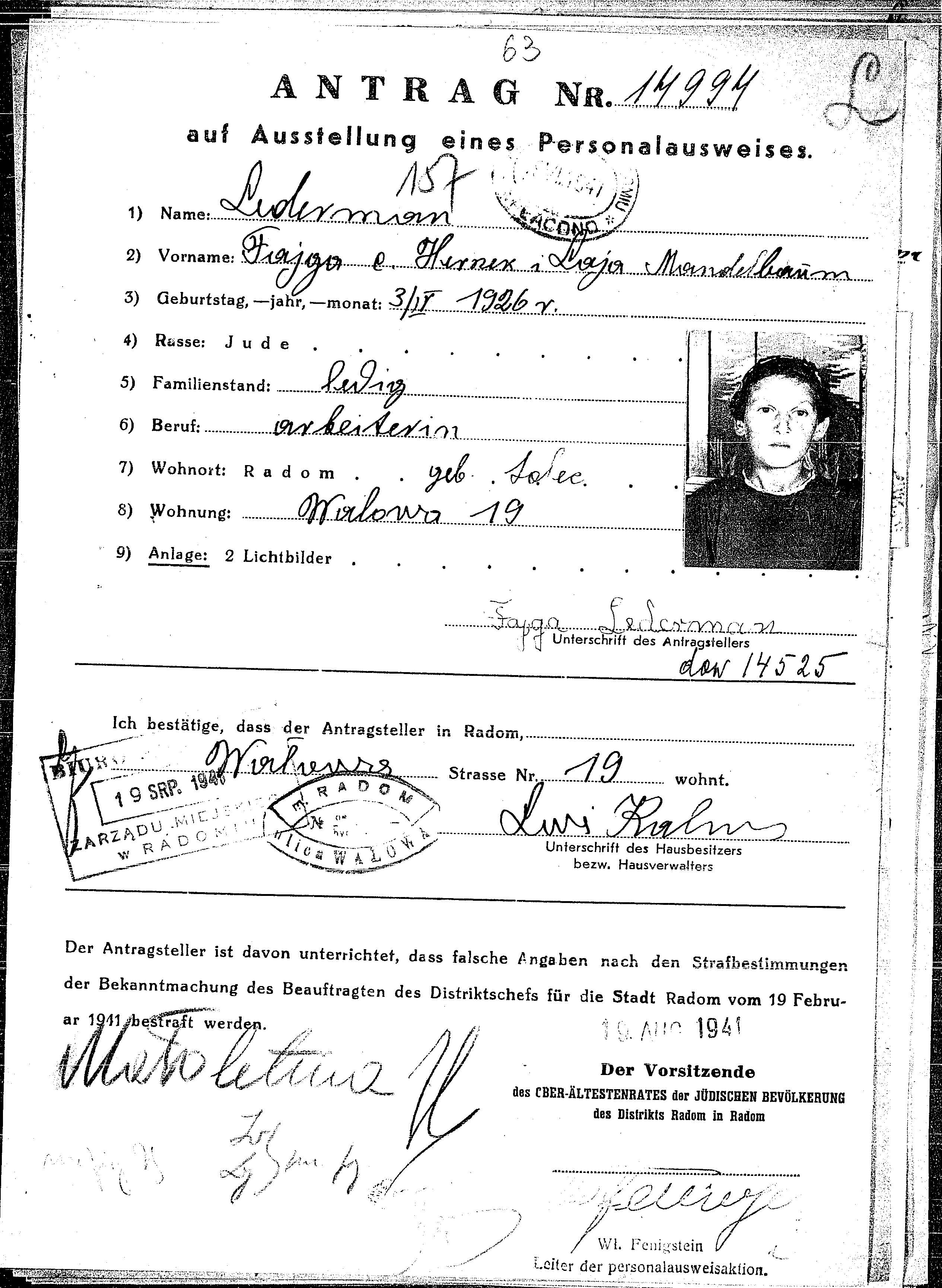 Fajga Lederman was born in Solec nad Wisla, Poland, 1926 to Herszek and Laja nee Mandelbaum. She was a worker and child. Prior to WWII she lived in Radom, Poland. During the war she was in Radom, Poland. Fajga Probably murdered the Shoah.