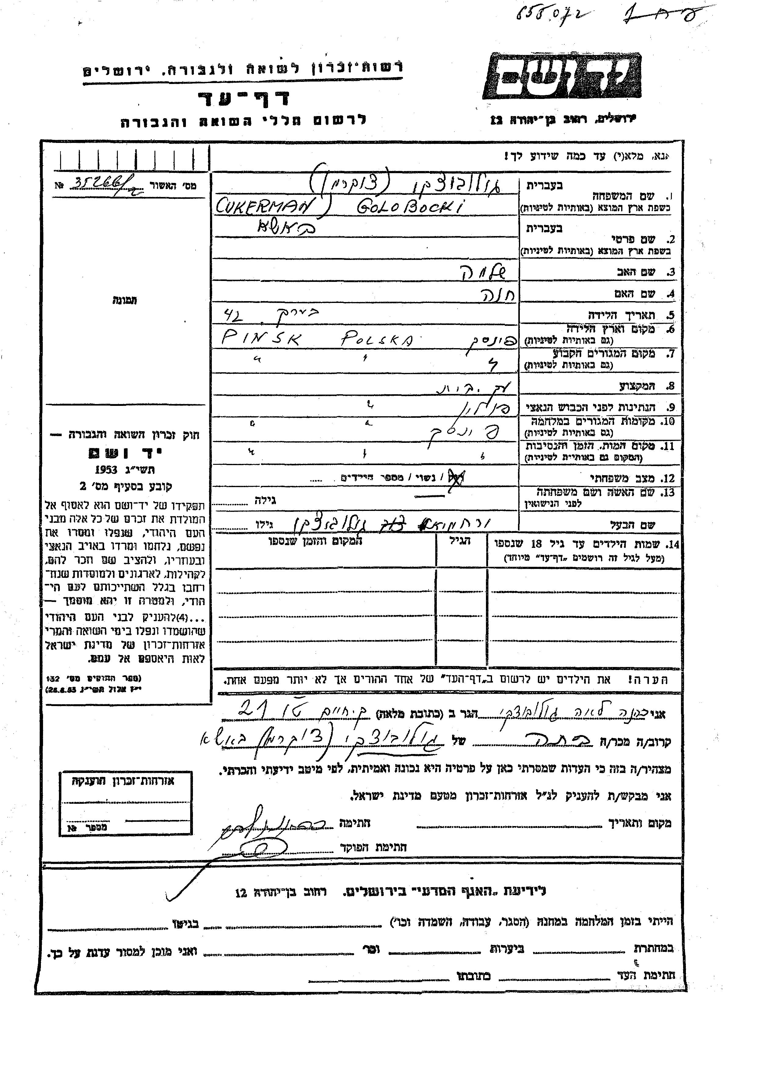 Basha Golobocki Cukerman nee Cukerman was born in Pinsk, Poland to Shlomo and Khana. She was a housewife and married to Yerakhmiel. Prior to WWII she lived in Pinsk, Poland. During the war she was in Pinsk, Poland. Basha was murdered in the Shoah. Place of death: Pinsk, Poland.