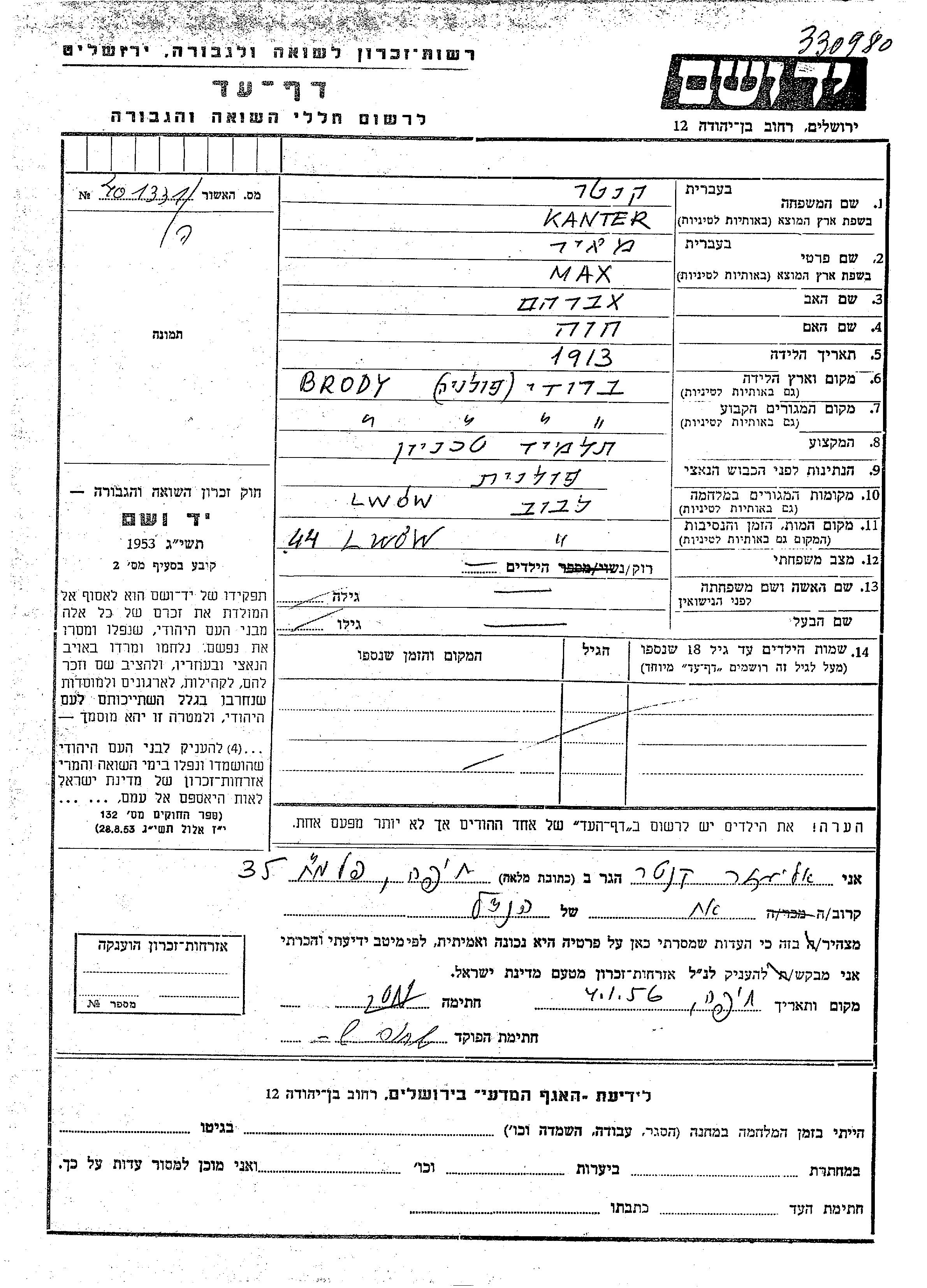 Max Meir Kanter was born in Brody, Poland, 1913 to Avraham and Khava. He was a student in a technical institute and single. Prior to WWII he lived in Brody, Poland. During the war he was in Lwow, Poland. Max Meir was murdered in the Shoah. Place of death: Lwow, Poland, 1944.