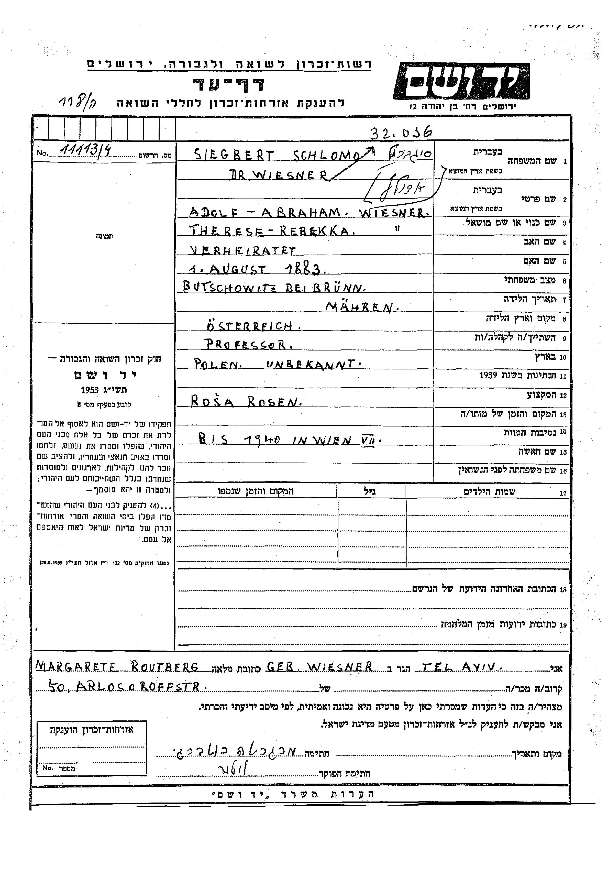 Dr. Siegbert Schlomo Wiesner was born in Butschowitz, Czechoslovakia, 1883 to Adolf Abraham and Therese Rebekka. He was a professor and married to Rosa nee Rosen. Prior to WWII he lived in Austria. During the war he was in Wien, Austria.