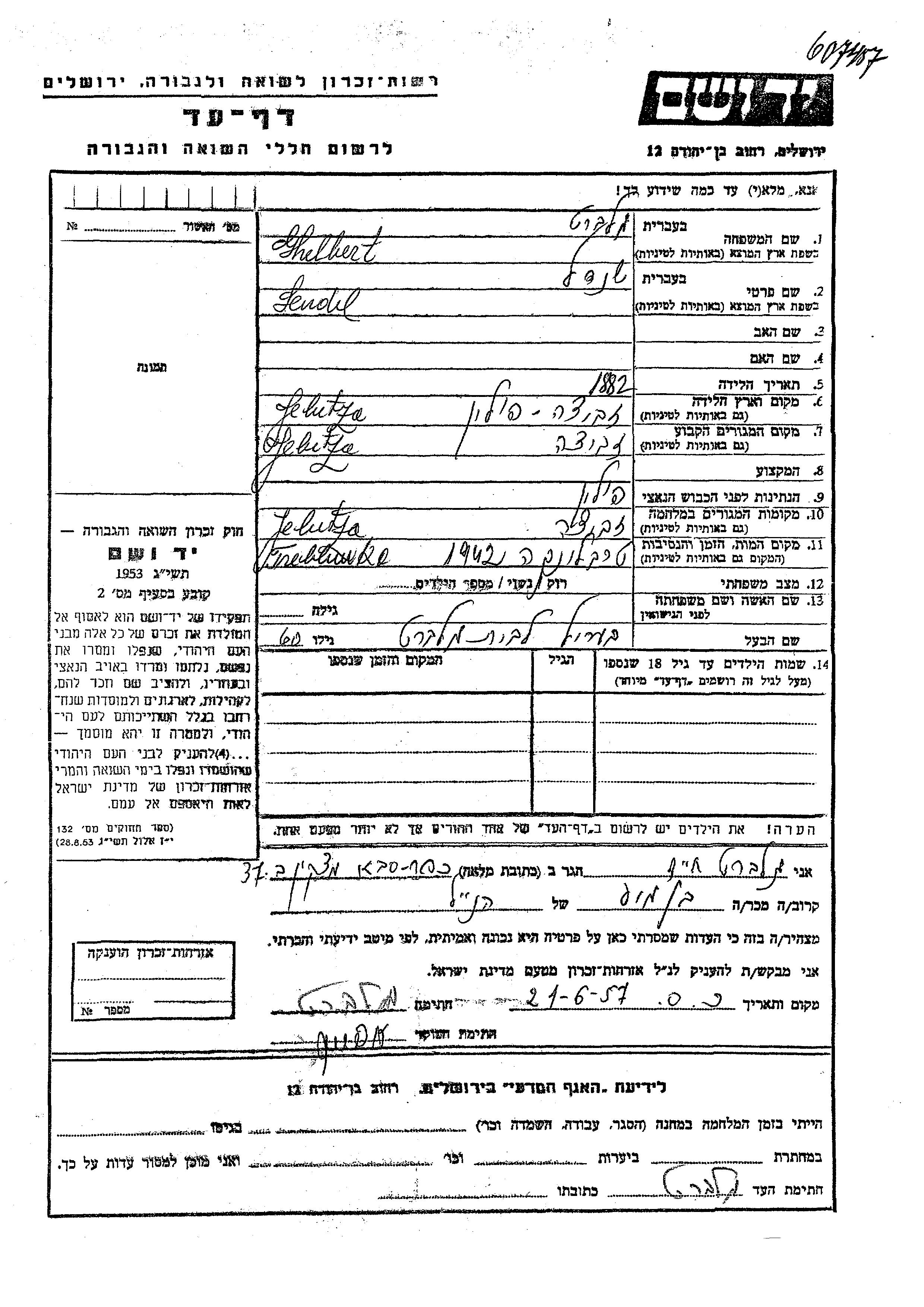 Sendel Ghelbert Gelbart nee Gelbart was born in Zbuczyn, Poland, 1882. She was married to Beril. Prior to WWII she lived in Zbuczyn, Poland. During the war she was in Zbuczyn, Poland. Sendel was murdered in the Shoah. Place of death: Treblinka, Poland, 1942.