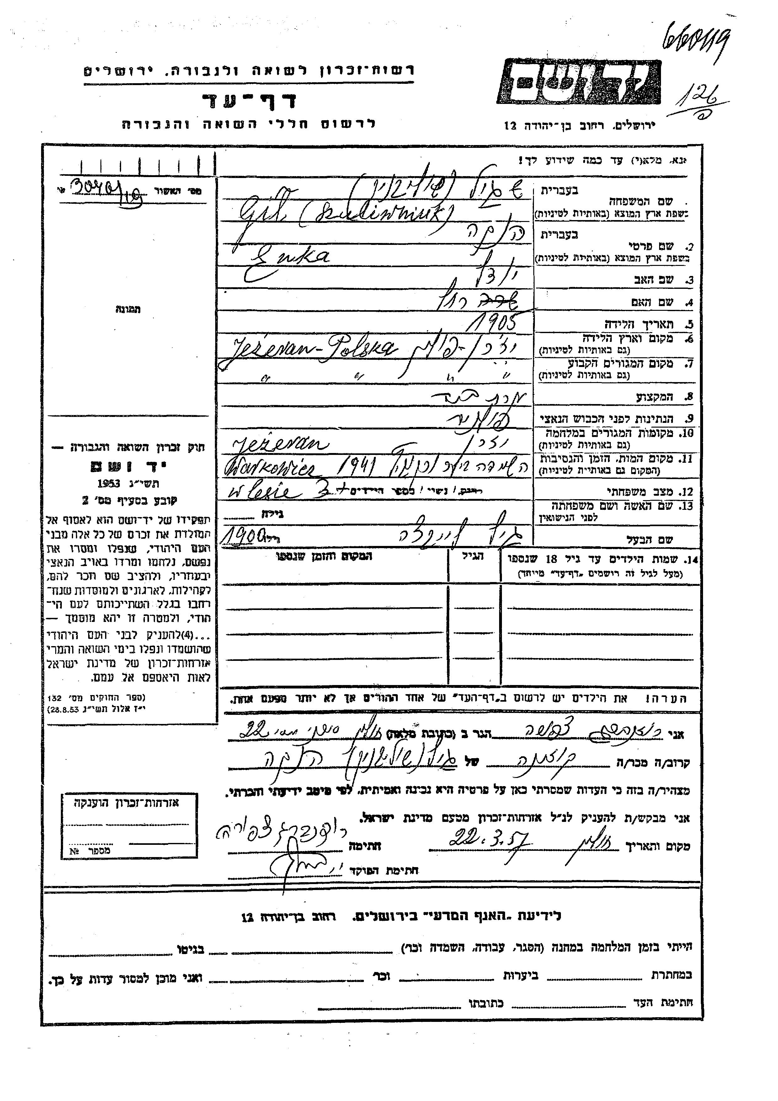 Enka Hanka Gil nee Szuliwniuk was born in Jeziorany, Poland, 1905 to Iudl and Rakhel. She was a housewife and married to Leibche. Prior to WWII she lived in Jeziorany, Poland. During the war she was in Jeziorany, Poland. Enka Hanka was murdered in the Shoah. Place of death: Warkowicze, Poland, 1941.