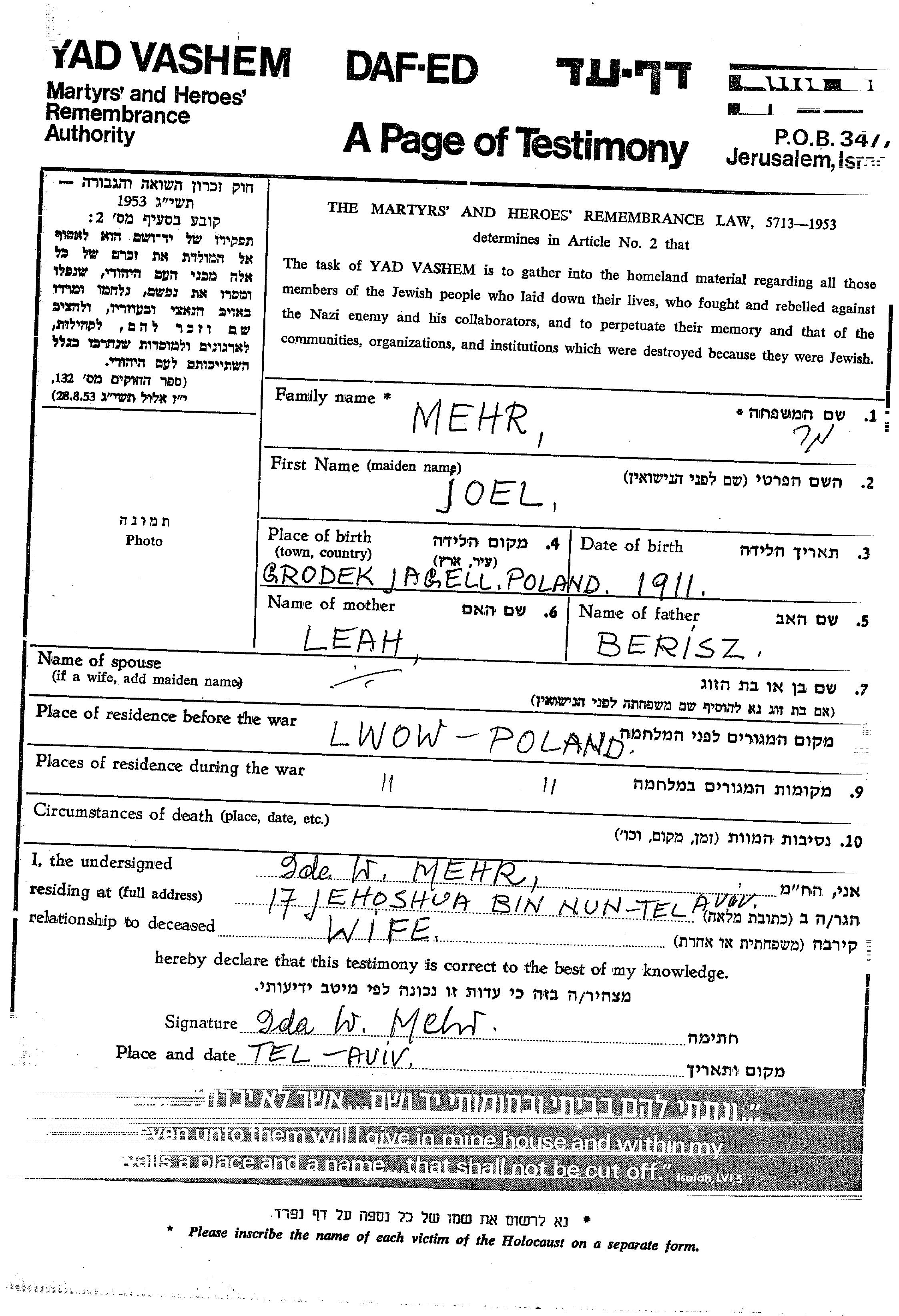 Joel Mehr was born in Gródek Jagielloński, Poland, 1911 to Berisz and Leah. Prior to WWII he lived in Lwow, Poland. During the war he was in Lwow, Poland. Joel was murdered in the Shoah.