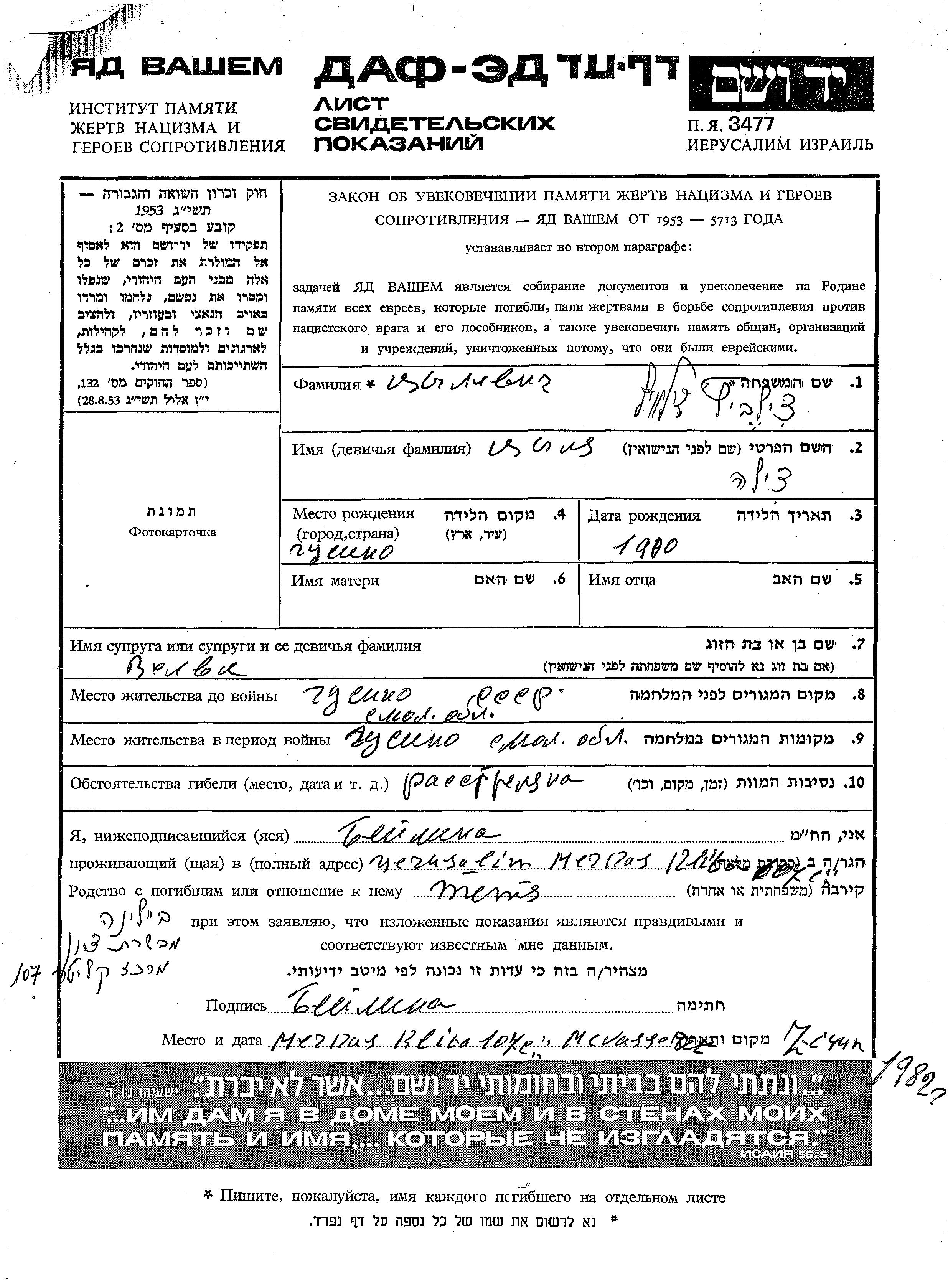 Tzilevitz Tzilia 1900 Gusino, Russia (USSR) Page of Testimony
