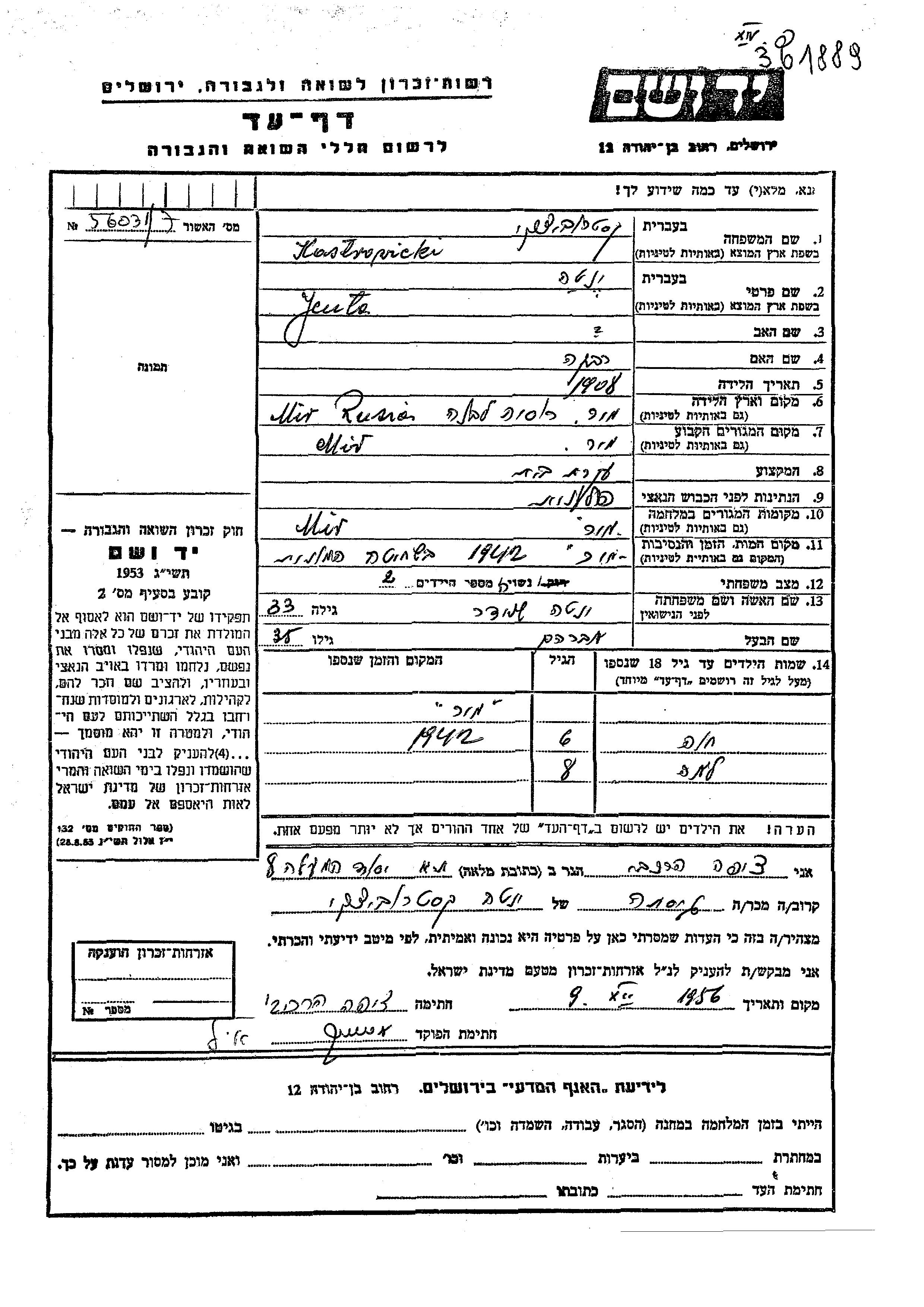 Yenta Kastrowicki nee Shneider was born in Nur, Poland, 1908 to Rivka. She was a housewife and married to Avraham. Prior to WWII she lived in Mir, Poland. During the war she was in Mir, Poland. Yenta was murdered in the Shoah. Place of death: Mir, Poland, 1942.