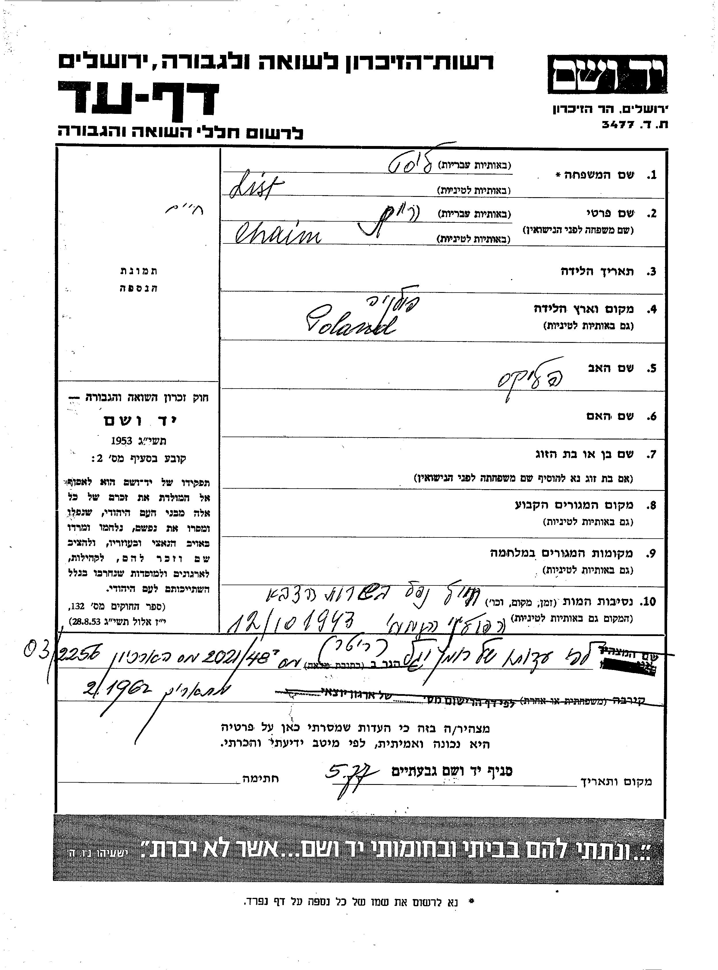 List Chaim unstated place, Page of Testimony