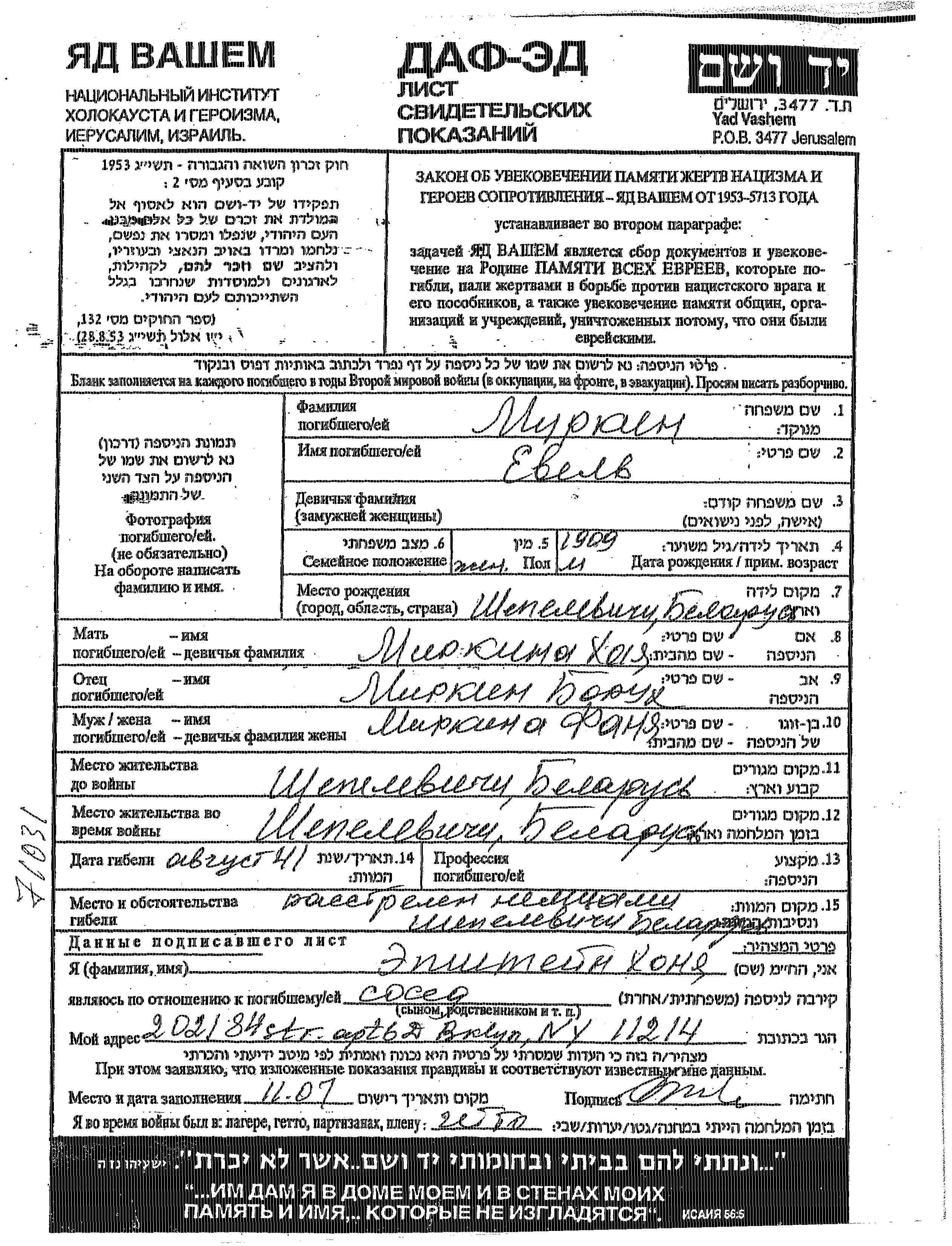 Yevel Mirkin was born in Shepelevichi, Belorussia (USSR), 1909 to Borukh and Khaya. He was married to Fanya. Prior to WWII he lived in Shepelevichi, Belorussia (USSR). During the war he was in Shepelevichi, Belorussia (USSR). Yevel was murdered in the Shoah. Place of death: Shepelevichi, Belorussia (USSR), 08/1941.