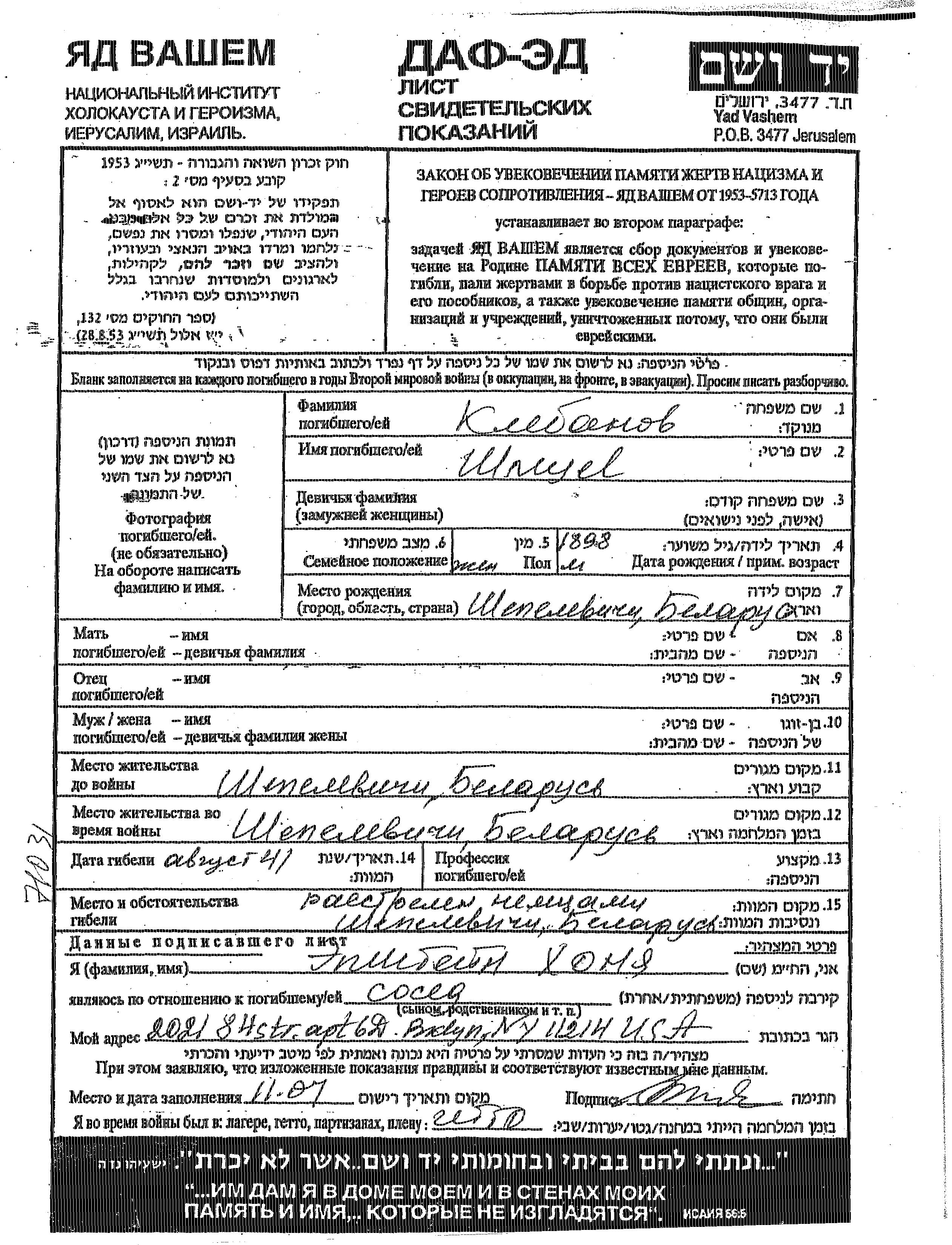 Shmuel Klebanov was born in Shepelevichi, Belorussia (USSR), 1898. He was married. Prior to WWII he lived in Shepelevichi, Belorussia (USSR). During the war he was in Shepelevichi, Belorussia (USSR). Shmuel was murdered in the Shoah. Place of death: Shepelevichi, Belorussia (USSR), 08/1941.