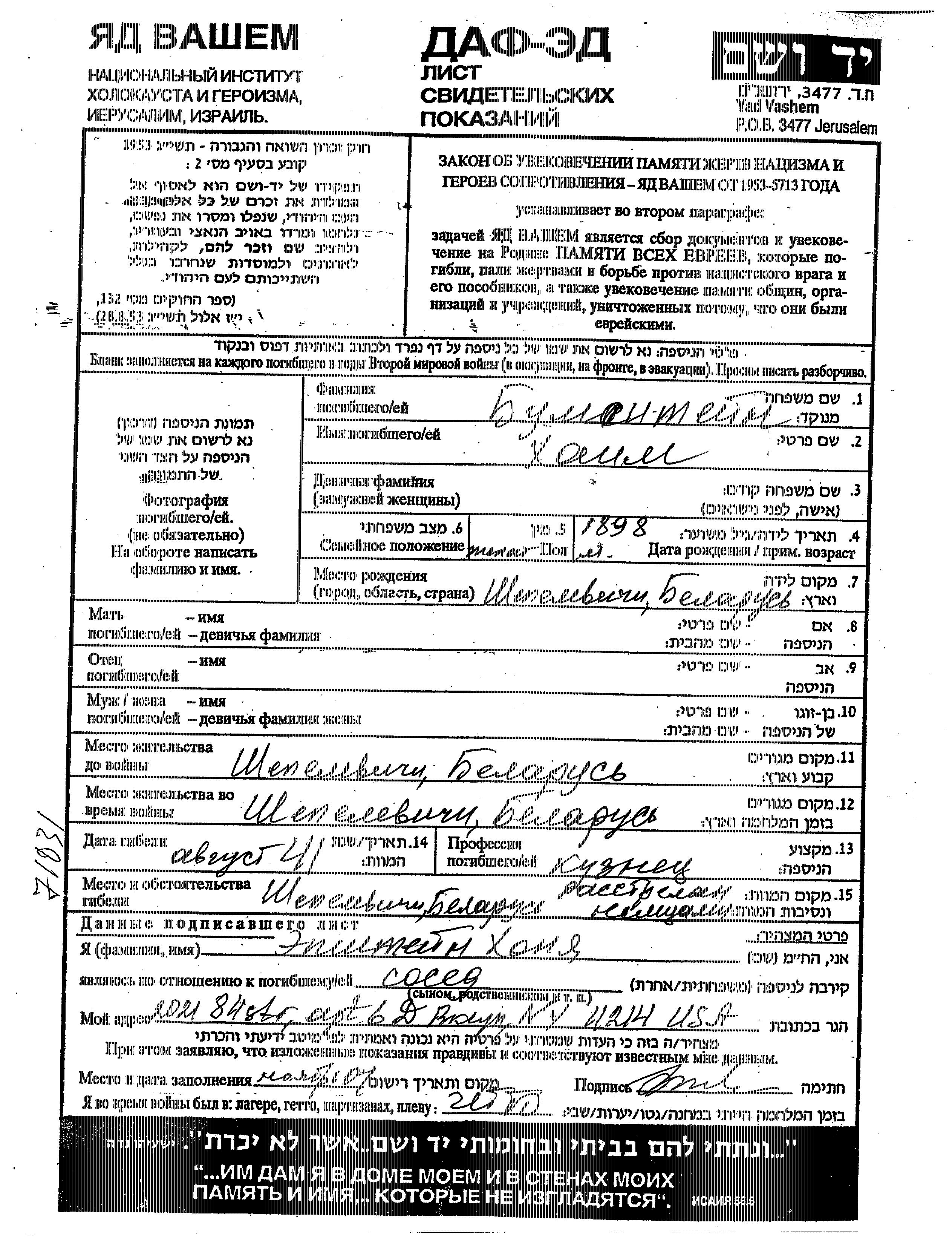 Khaim Bumshtein was born in Shepelevichi, Belorussia (USSR), 1898. He was a blacksmith. Prior to WWII he lived in Shepelevichi, Belorussia (USSR). During the war he was in Shepelevichi, Belorussia (USSR). Khaim was murdered in the Shoah. Place of death: Shepelevichi, Belorussia (USSR), 08/1941.