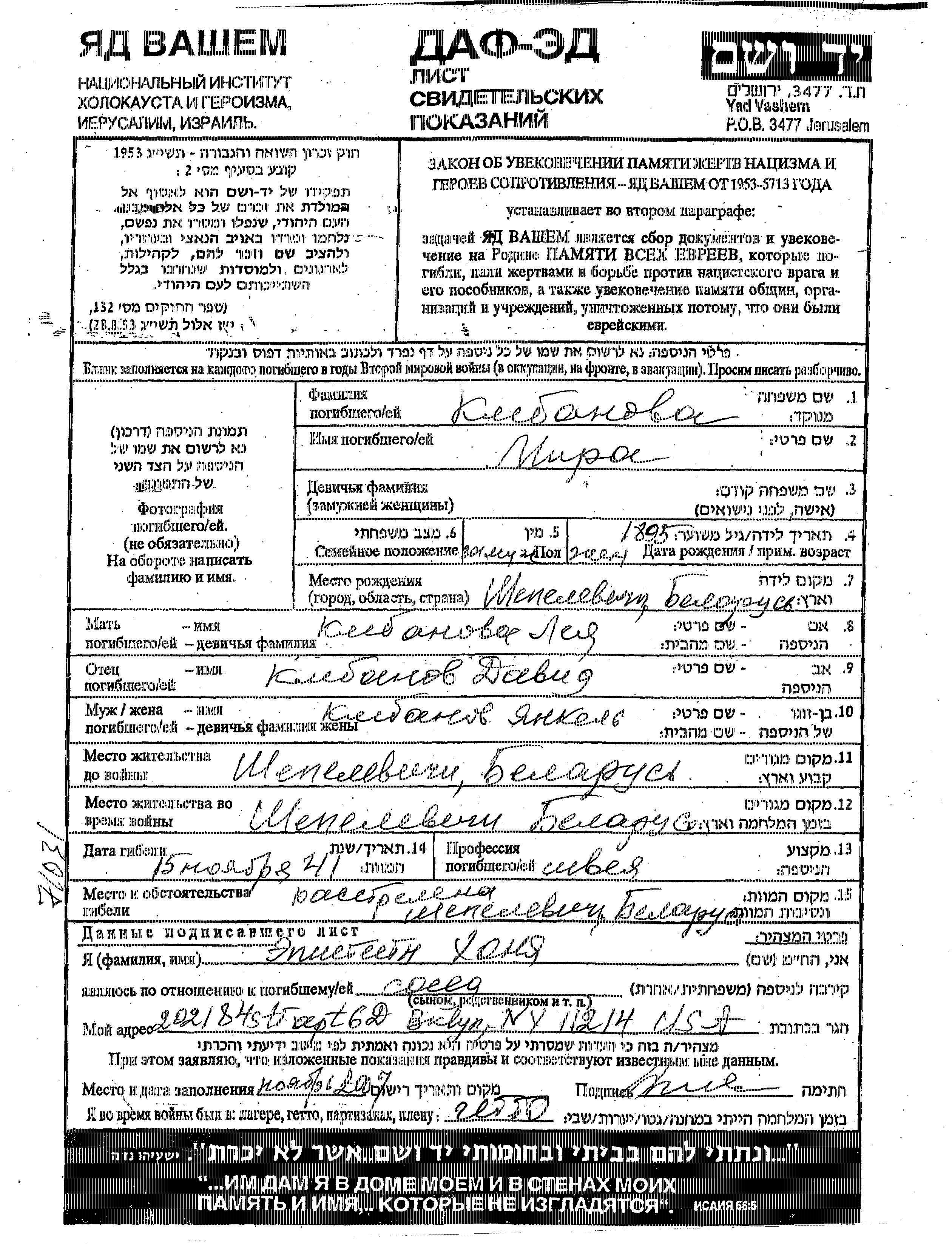 Mira Klebanova was born in Shepelevichi, Belorussia (USSR), 1895 to David and Leya. She was a shveya russian and married to Yankel. Prior to WWII she lived in Shepelevichi, Belorussia (USSR). During the war she was in Shepelevichi, Belorussia (USSR). Mira was murdered in the Shoah. Place of death: Shepelevichi, Belorussia (USSR), 15/11/1941.