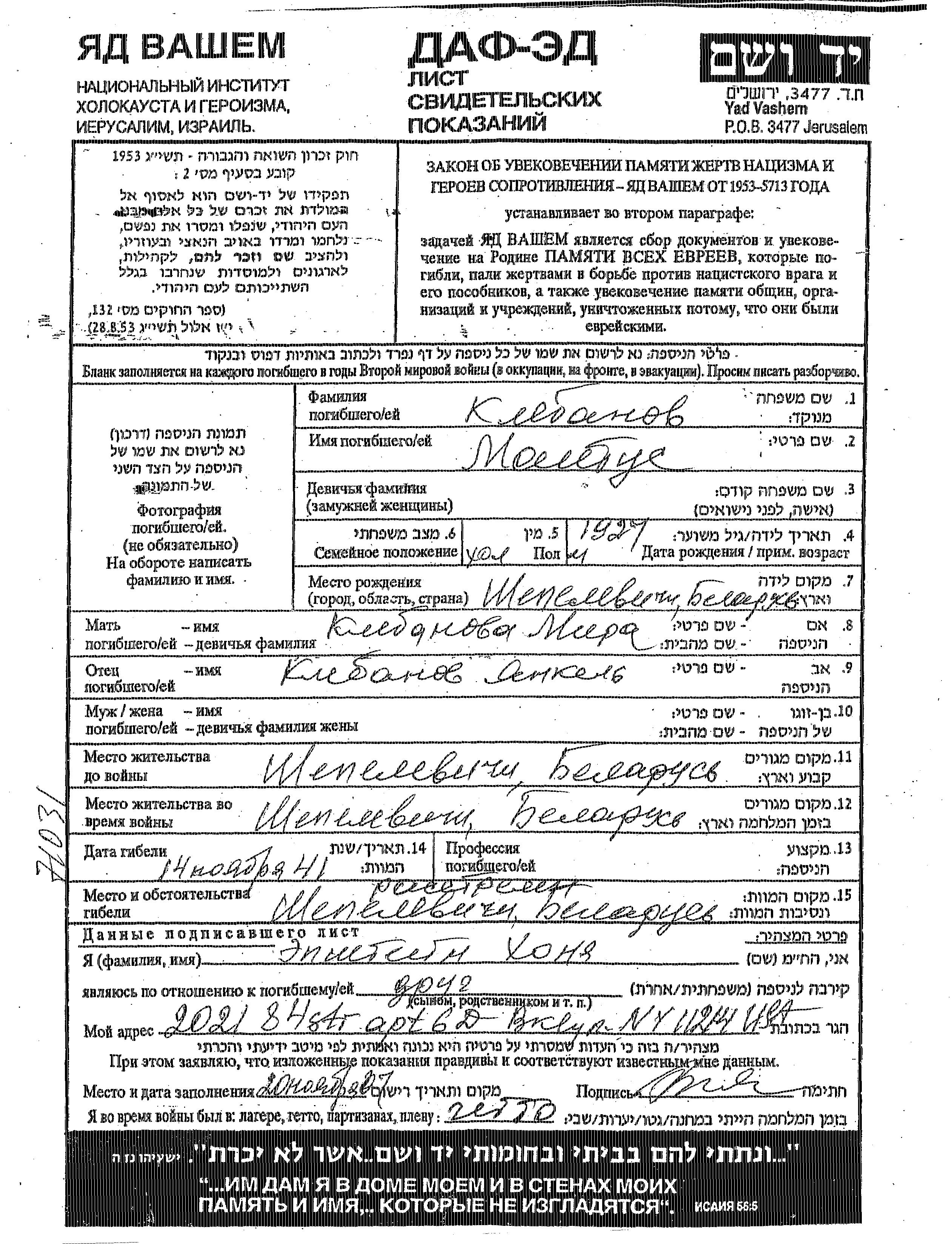 Matus Klebanov was born in Shepelevichi, Belorussia (USSR), 1927 to Yankel and Mira. He was teenager. Prior to WWII he lived in Shepelevichi, Belorussia (USSR). During the war he was in Shepelevichi, Belorussia (USSR). Matus was murdered in the Shoah. Place of death: Shepelevichi, Belorussia (USSR), 14/11/1941.