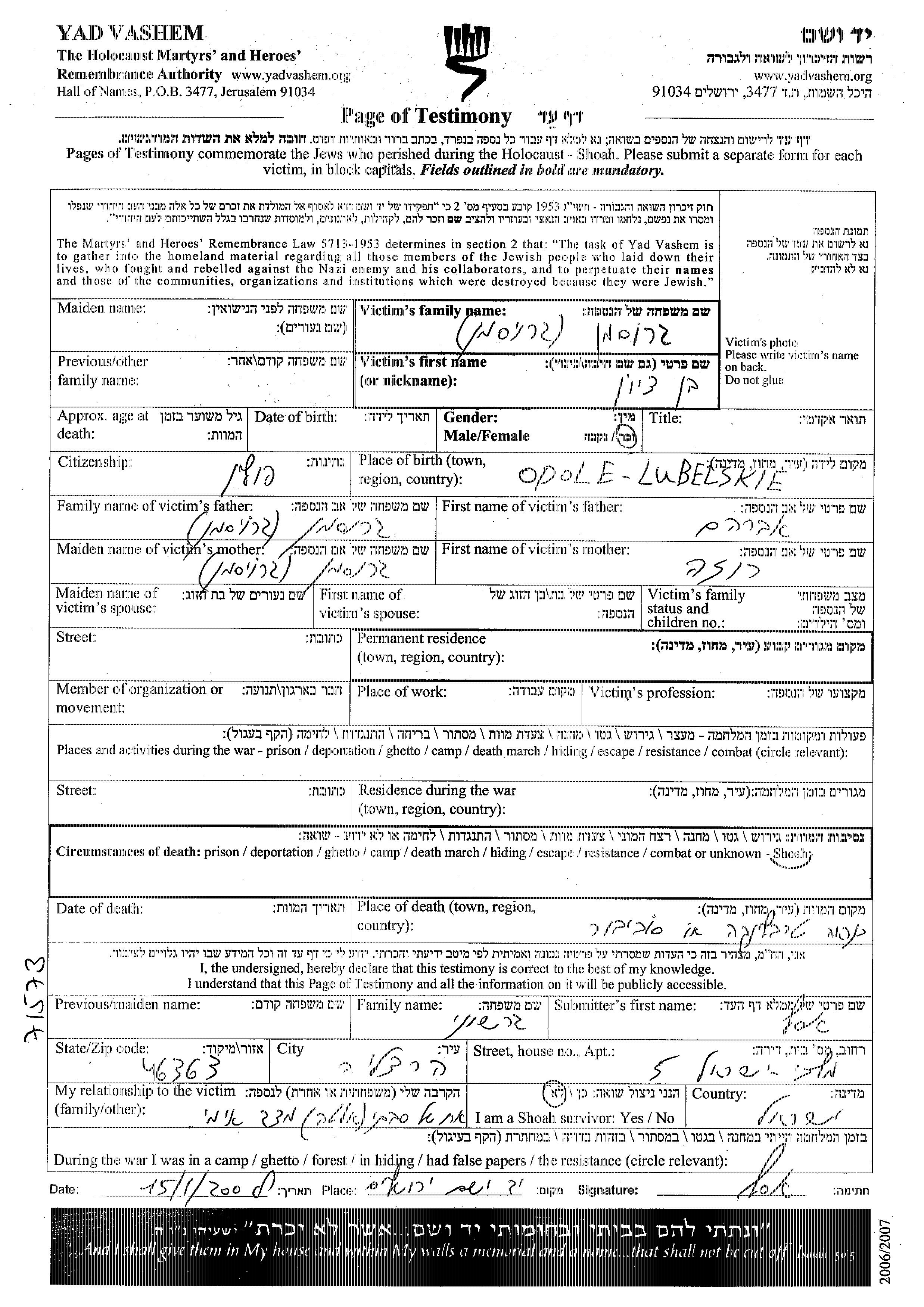Yad Vashem - Pages of Testimony Names Memorial Collection