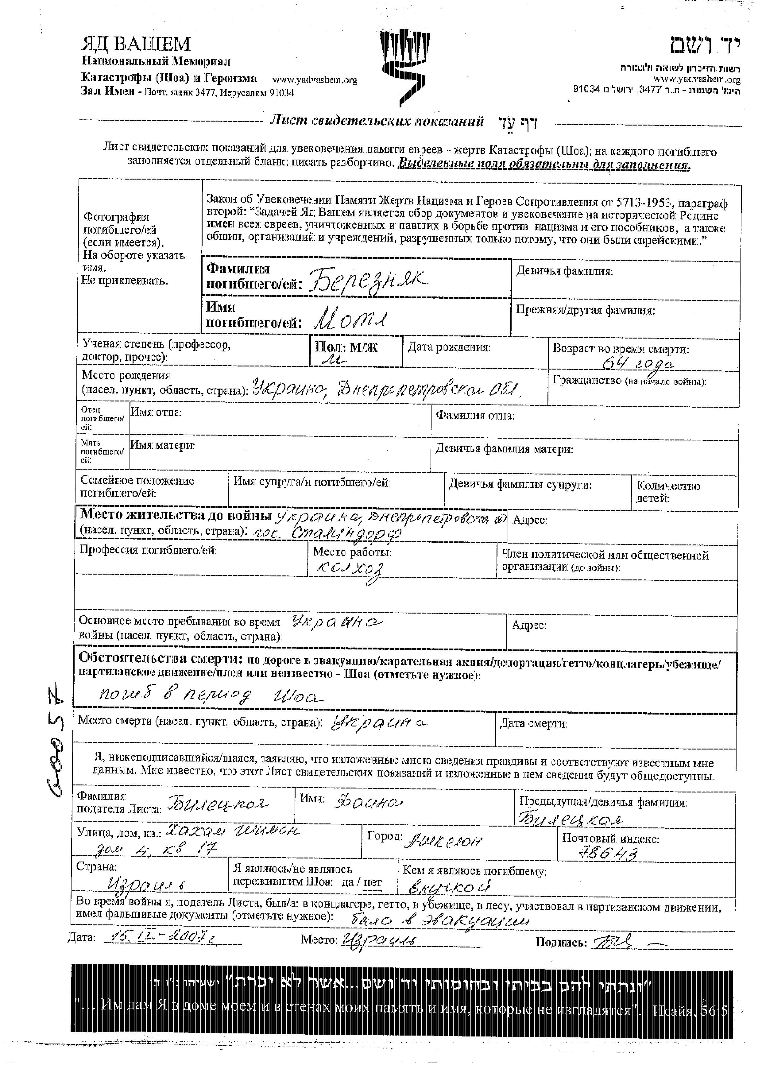Bereznyak Motl Stalindorf, Ukraine (USSR) Page of Testimony