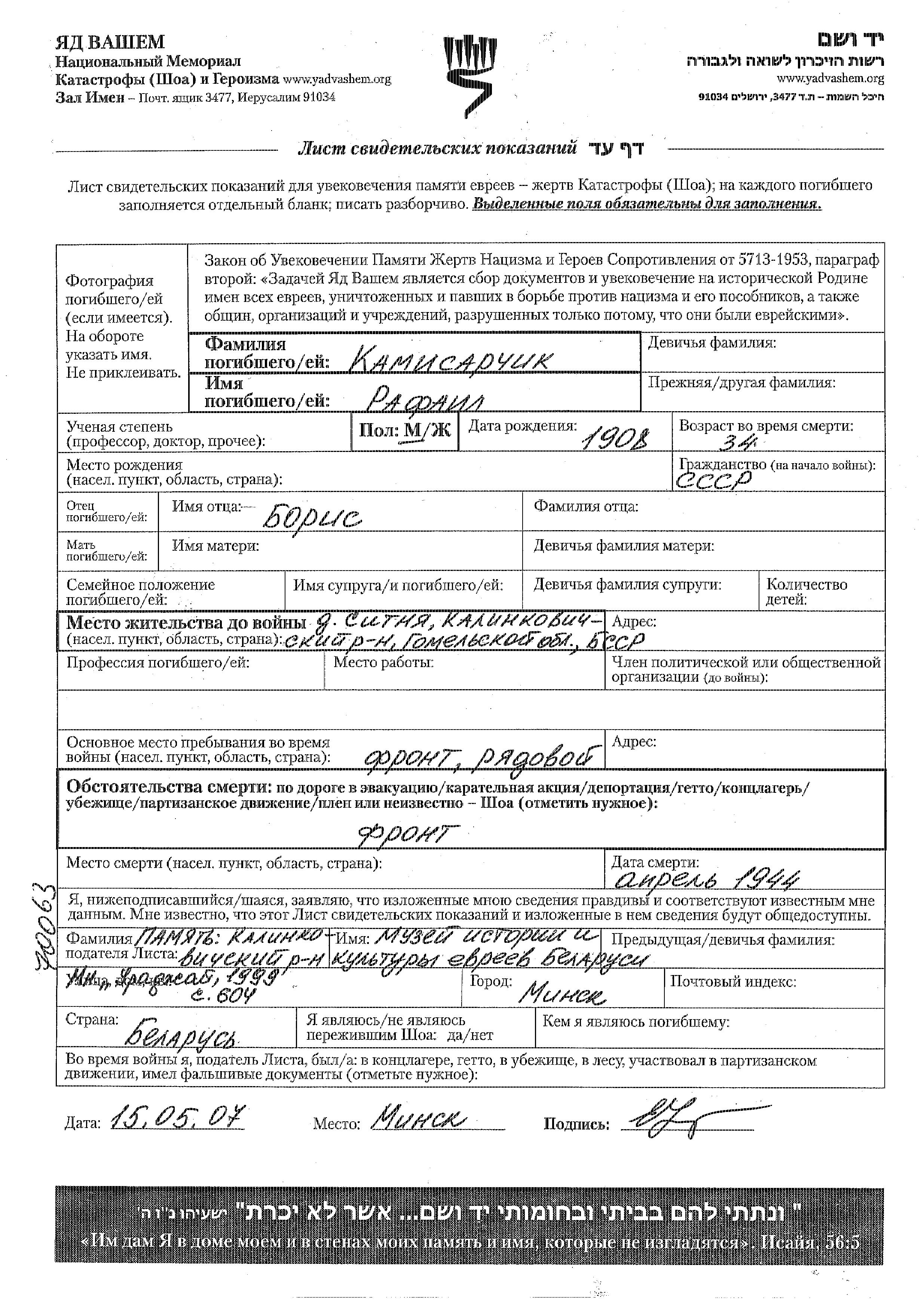 Rafail Kamisarchik was born, 1908 to Boris. He was a ryadovoi. Prior to WWII he lived in Sitnya, Belorussia (USSR). During the war he was in the Soviet armed forces. Rafail was killed in military service in WWII. Place of death: unknown, 04/1944.