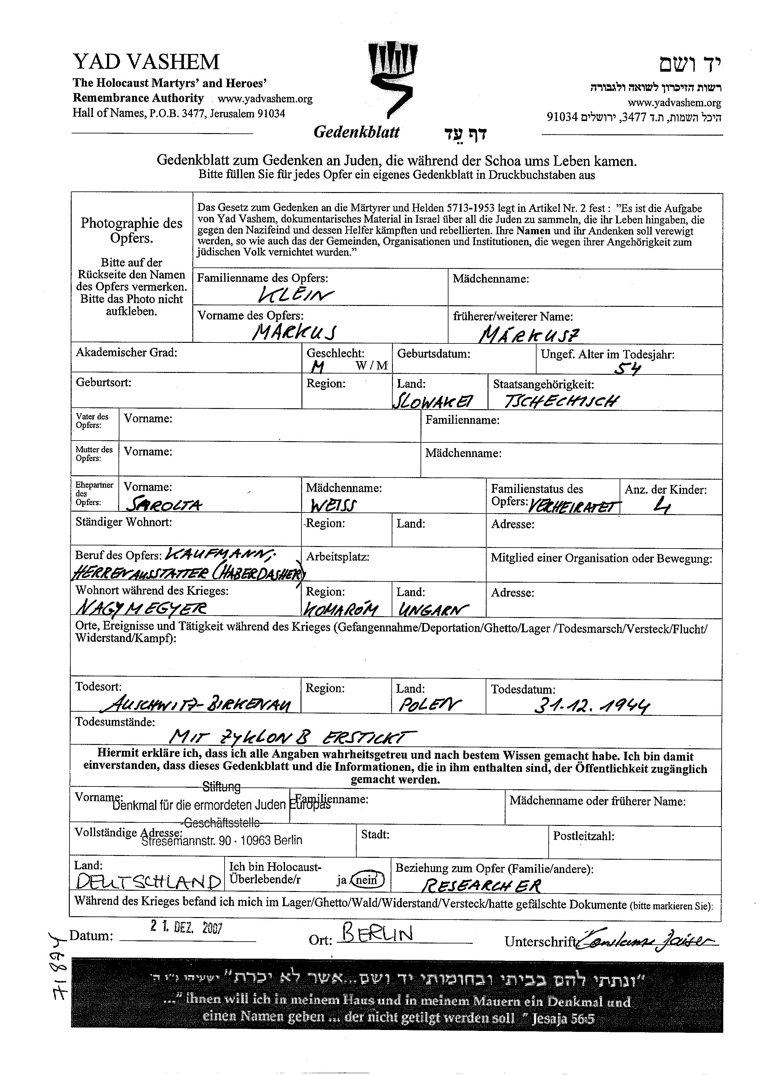 Markus Klein was born in Slovakia, Czechoslovakia. He was a haberdasher and married to Sarolta nee Weiss. During the war he was in Nagymegyer, Czechoslovakia. Markus was murdered in the Shoah. Place of death: Birkenau, Poland, 31/12/1944.