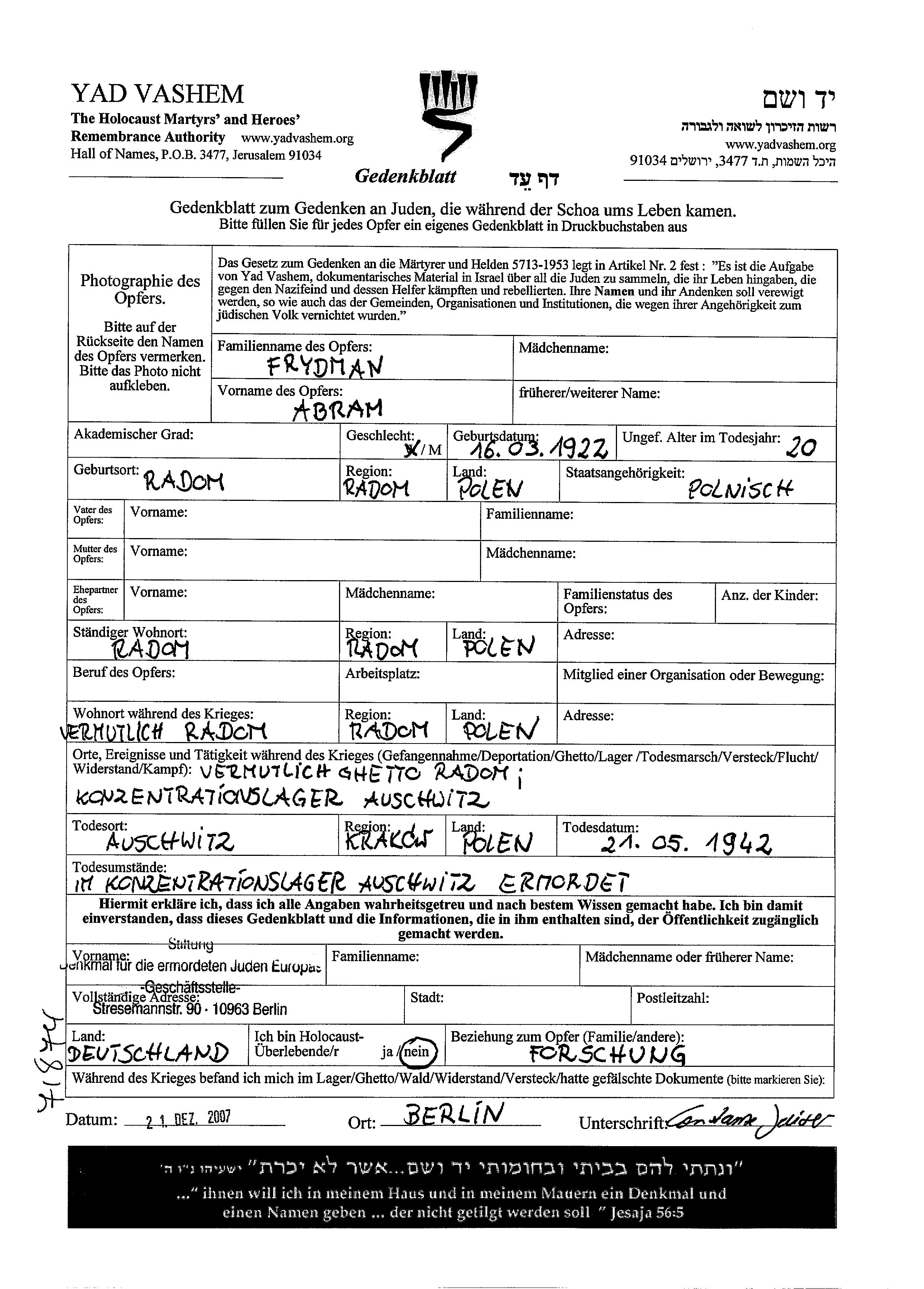 Abram Frydman was born in Radom, Poland, 1922. Prior to WWII he lived in Radom, Poland. During the war he was in Radom, Poland. Abram was murdered in the Shoah. Place of death: Auschwitz, Poland, 21/05/1942.