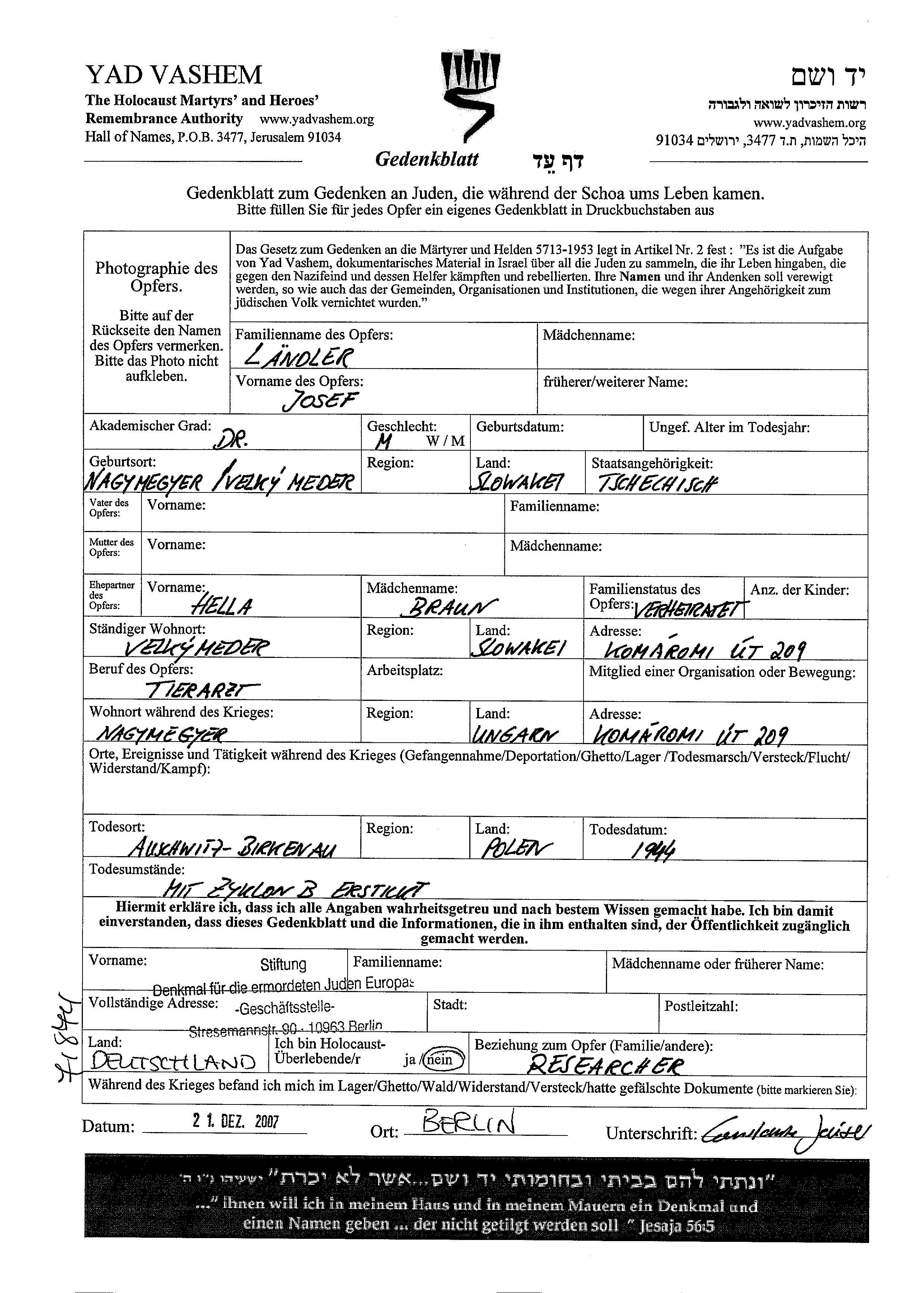 Dr. Josef Laendler was born in Velky Meder, Czechoslovakia. He was a tierarzt and married to Hella nee Braun. Prior to WWII he lived in Velky Meder, Czechoslovakia. During the war he was in Nagymegyer, Hungary. Dr. Laendler was murdered in the Shoah. Place of death: Auschwitz, Poland, 1944.