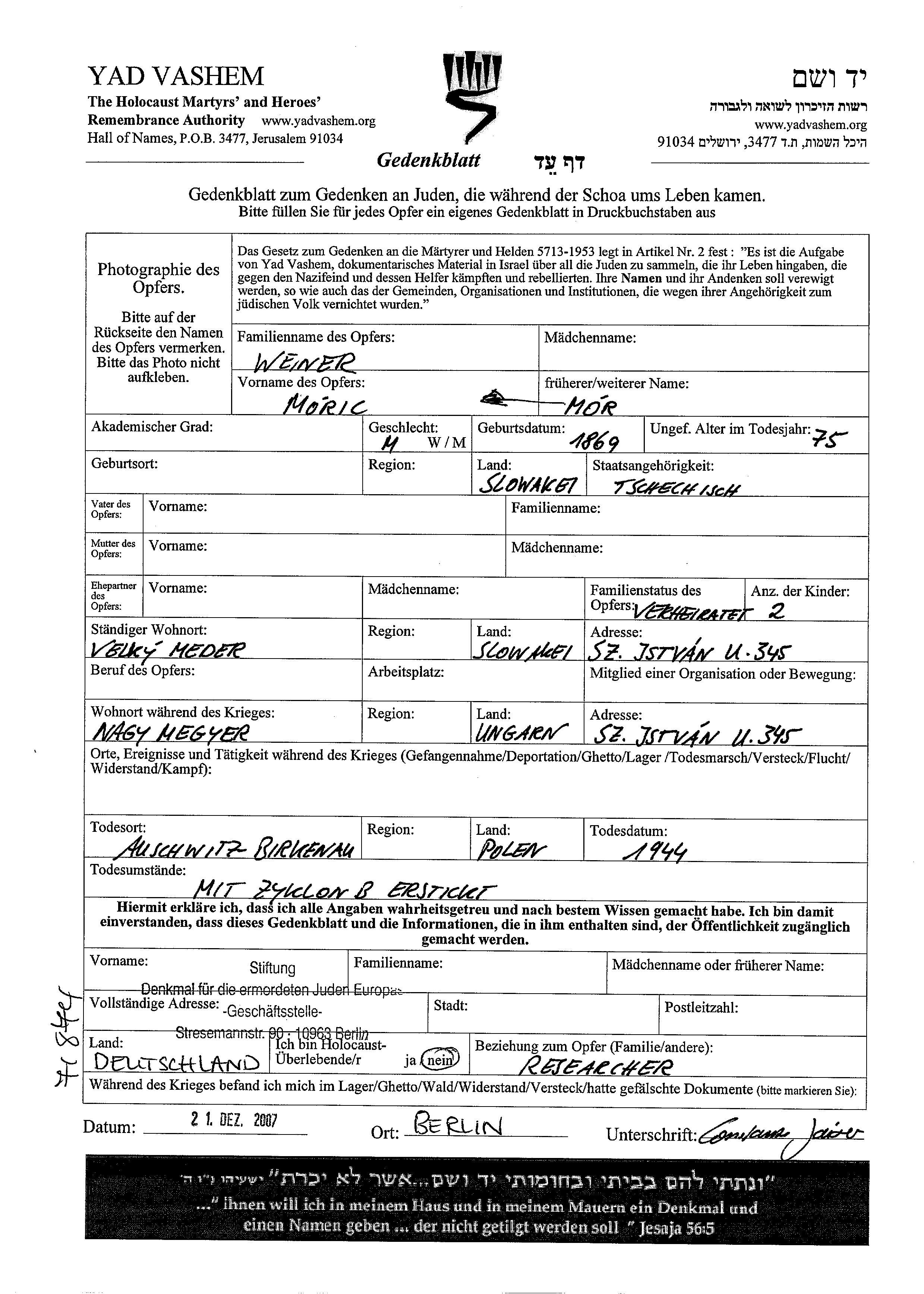 Moric Weiner was born in Slovakia, Czechoslovakia, 1869. He was married. Prior to WWII he lived in Velki Mager, Czechoslovakia. During the war he was in Nagy Magyer, Czechoslovakia. Moric was murdered in the Shoah. Place of death: Birkenau, Poland, 1944.