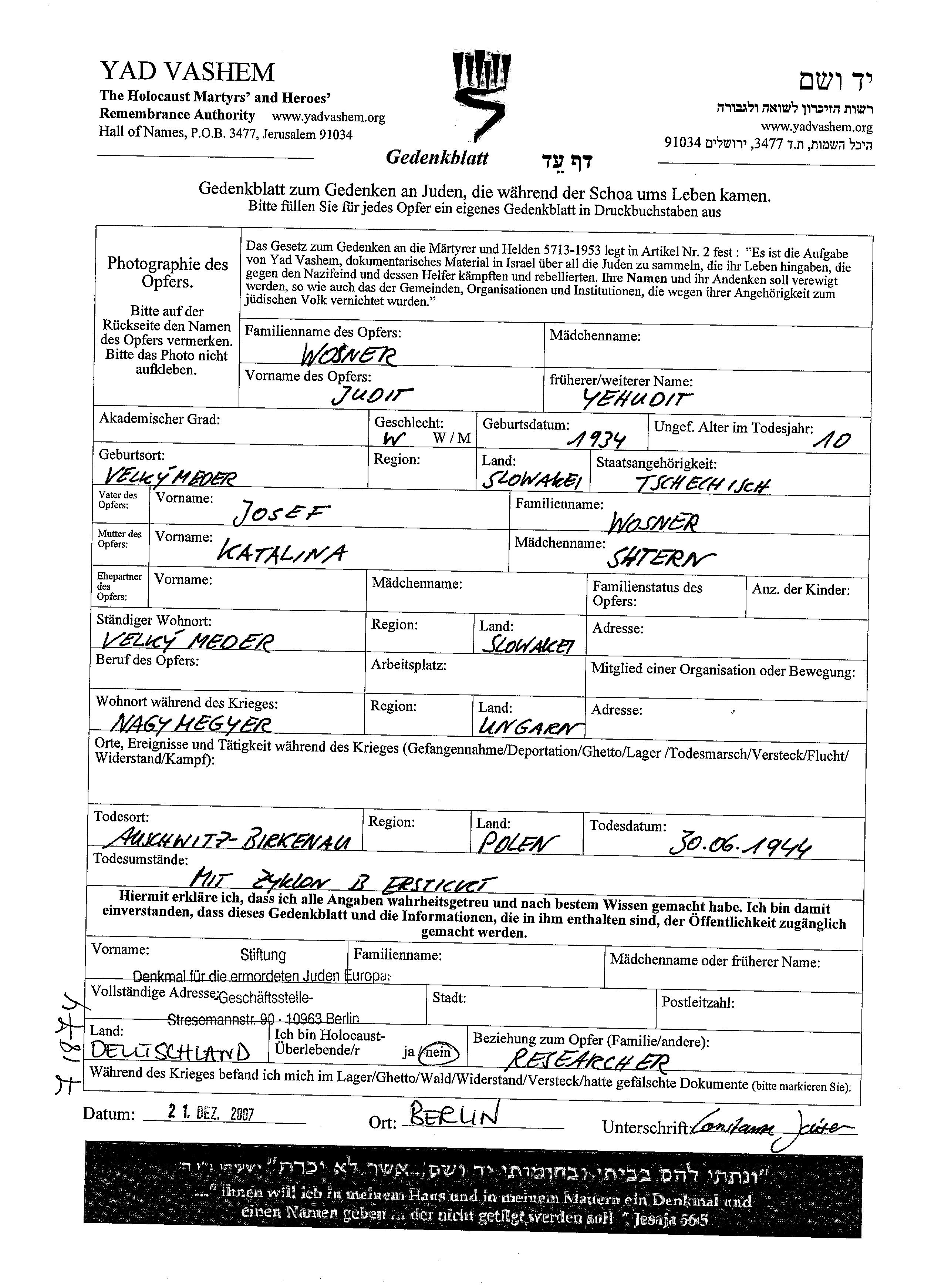 Judit Wosner was born in Velky Mager, Czechoslovakia, 1934 to Josef and Katalin nee Shtern. Prior to WWII she lived in Velky Mager, Czechoslovakia. During the war she was in Nagy Magyer, Czechoslovakia. Judit was murdered in the Shoah. Place of death: Birkenau, Poland, 30/06/1944.