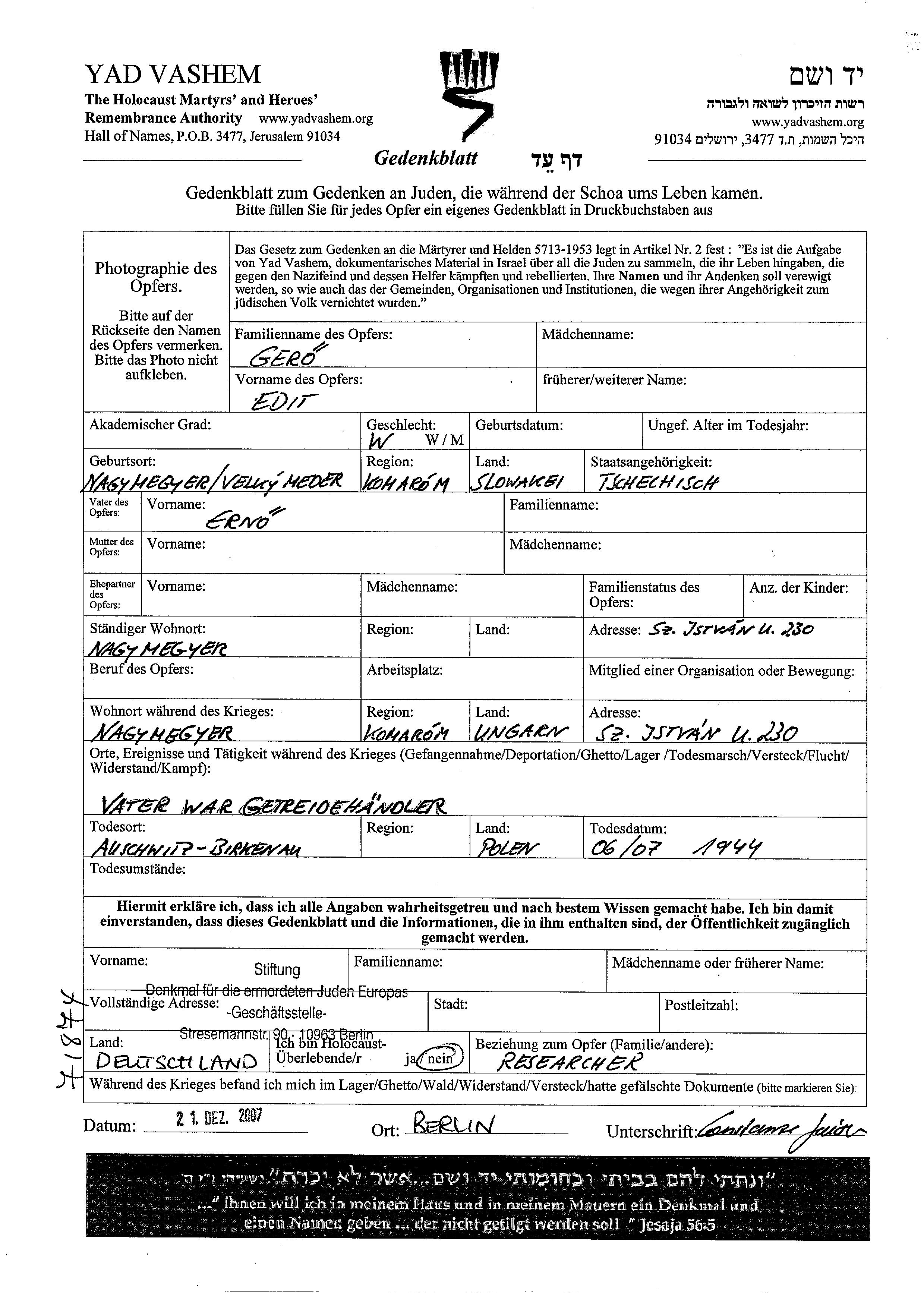 Edit Gero was born in Velky Meder, Czechoslovakia to Erno. Prior to WWII she lived in Nagymegyer, Czechoslovakia. During the war she was in Nagymegyer, Czechoslovakia. Edit was murdered in the Shoah. Place of death: Auschwitz, Poland, 06/07/1944.