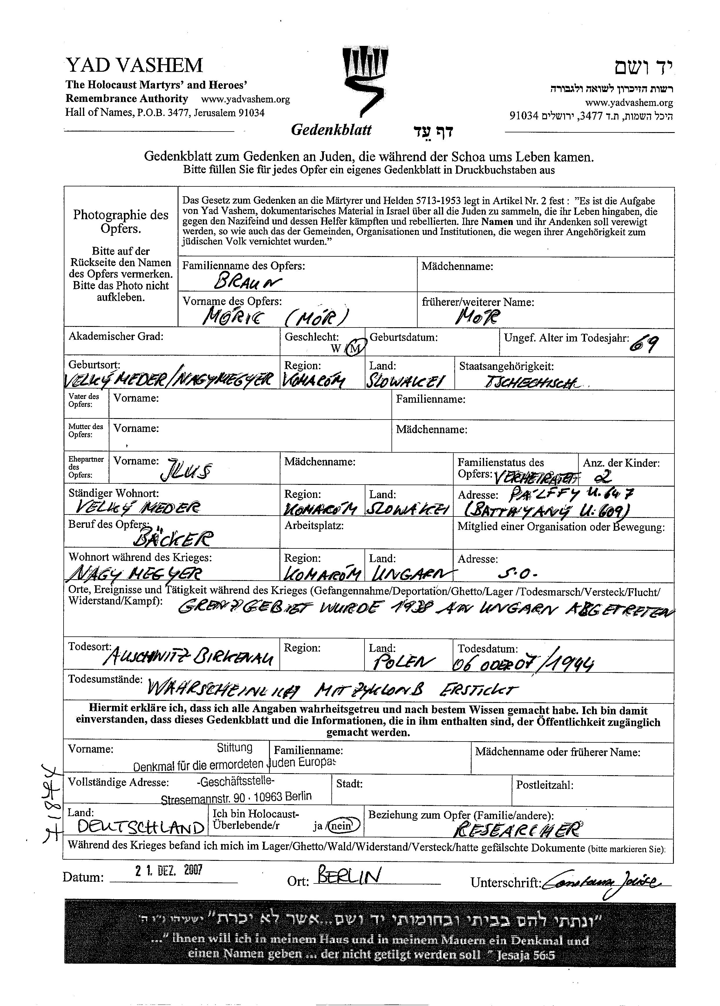 Moric Mor Braun was born in Velky Meder, Czechoslovakia. He was a baker and married to Jlus. Prior to WWII he lived in Velky Meder, Czechoslovakia. During the war he was in Nagymegyer, Czechoslovakia. Moric Mor was murdered in the Shoah. Place of death: Auschwitz, Poland, 06/1944.
