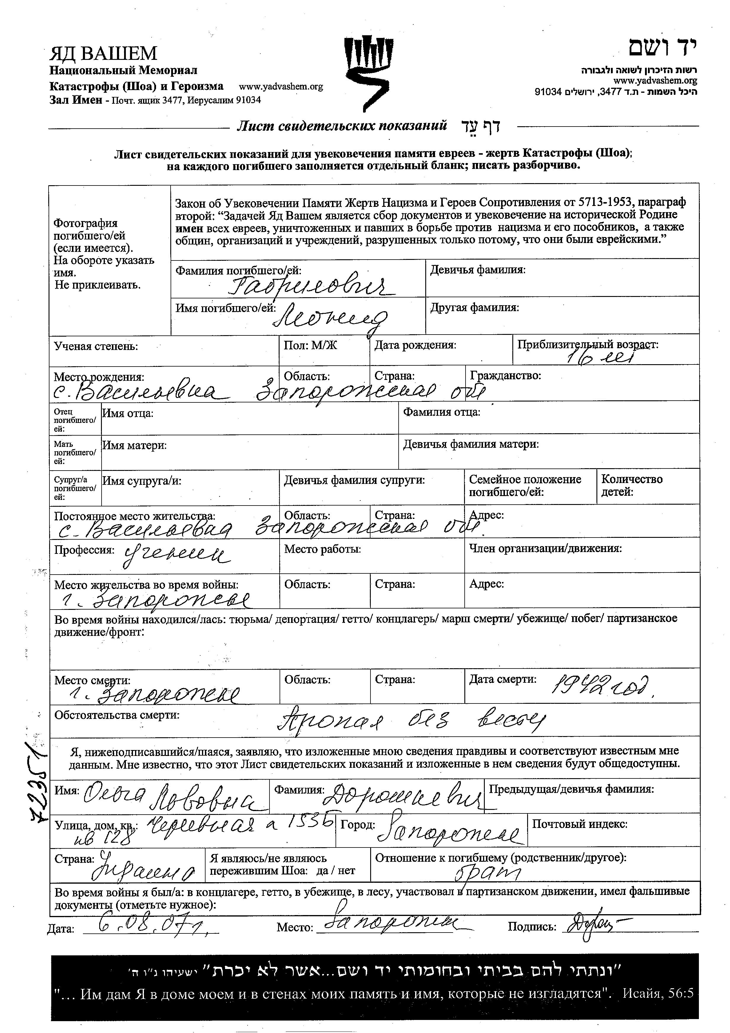 Leonid Gabrilovich was born in Vasilyevka, Ukraine (USSR). He was a pupil. Prior to WWII he lived in Vasilyevka, Ukraine (USSR). During the war he was in the Soviet armed forces. Leonid was murdered in the Shoah. Place of death: Zaporozhye, Ukraine (USSR), 1942.
