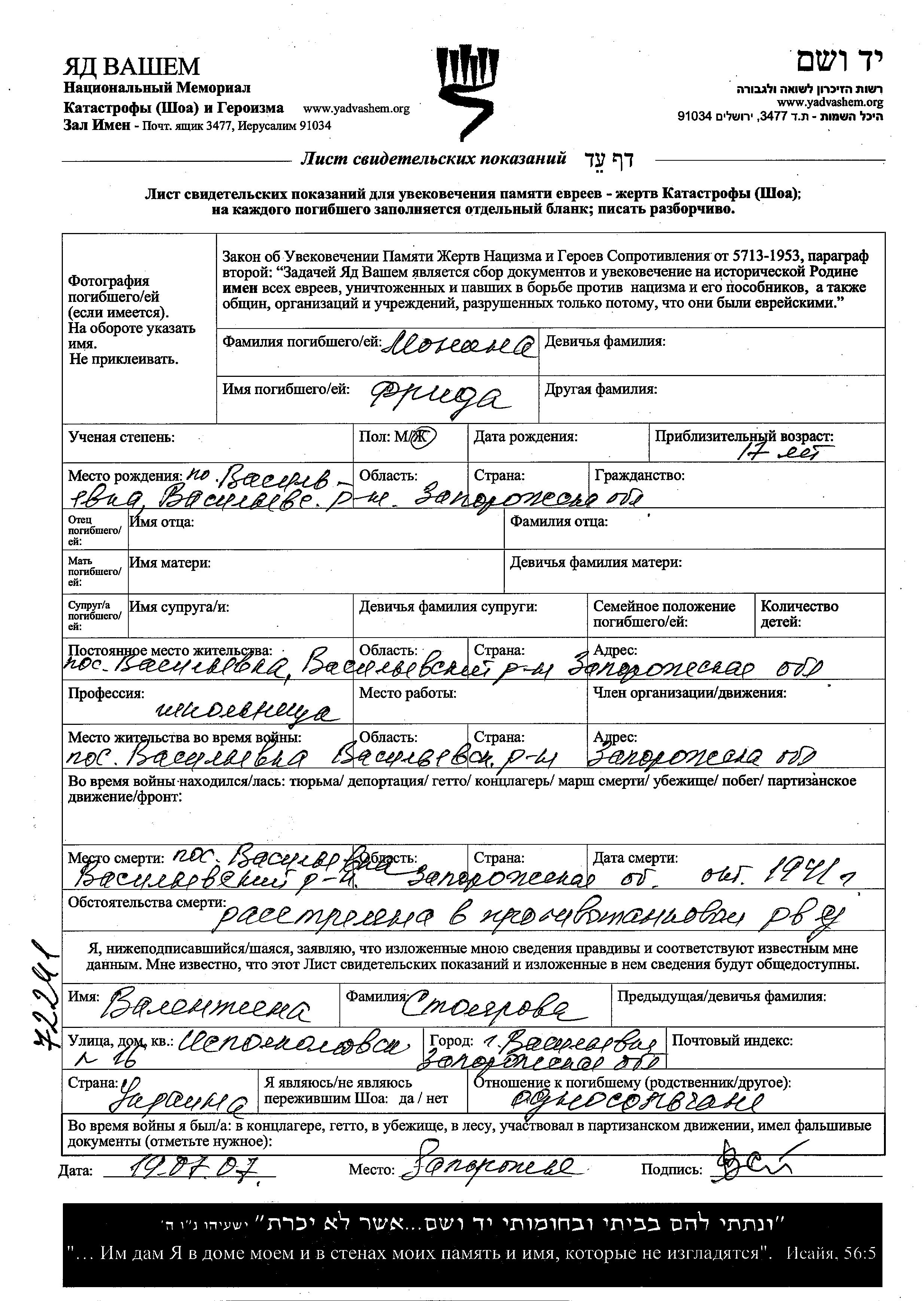 Monina Frida Vasilyevka, Ukraine (USSR) Page of Testimony
