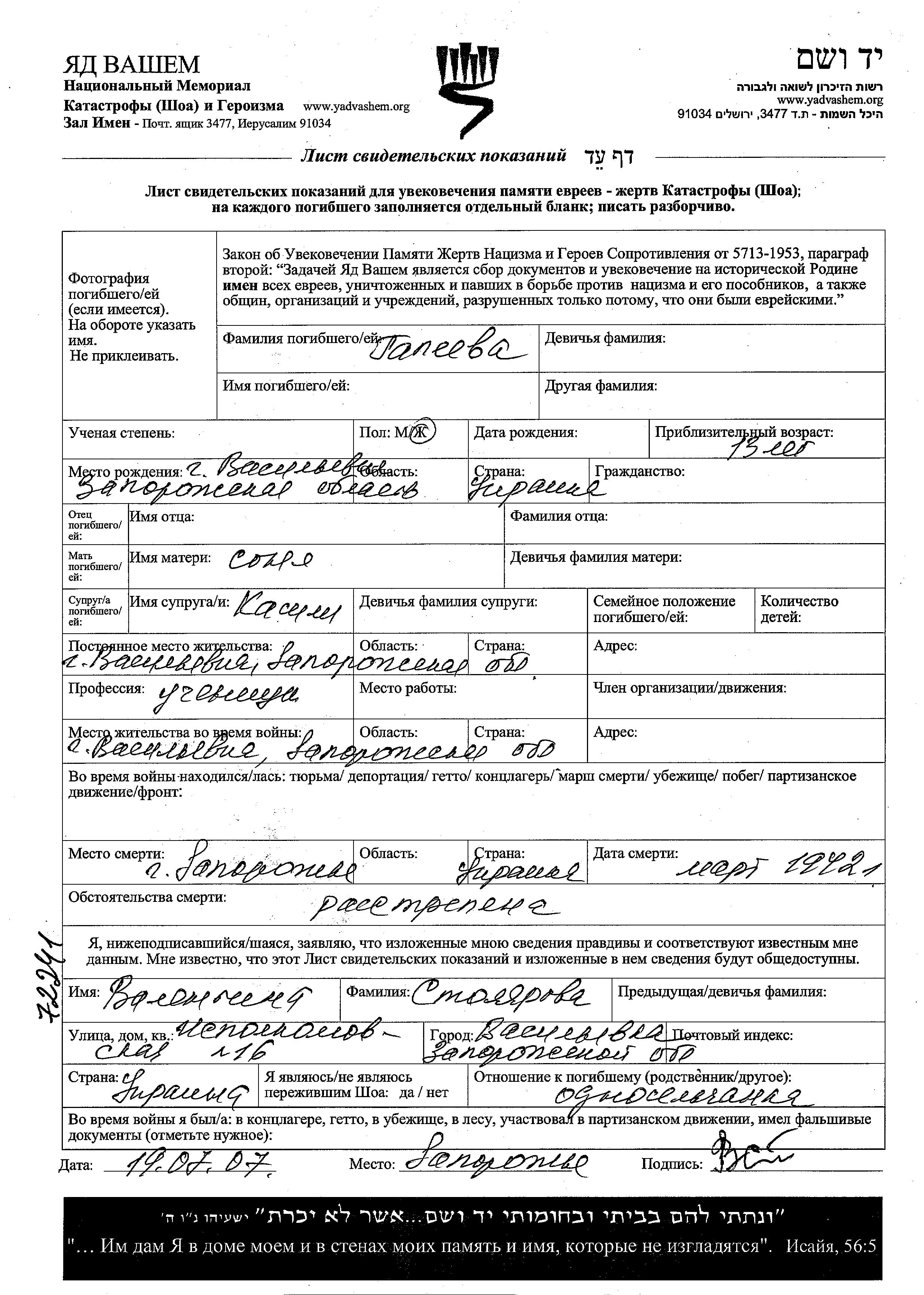 Galeyeva First name unknown Vasilyevka, Ukraine (USSR) Page of Testimony