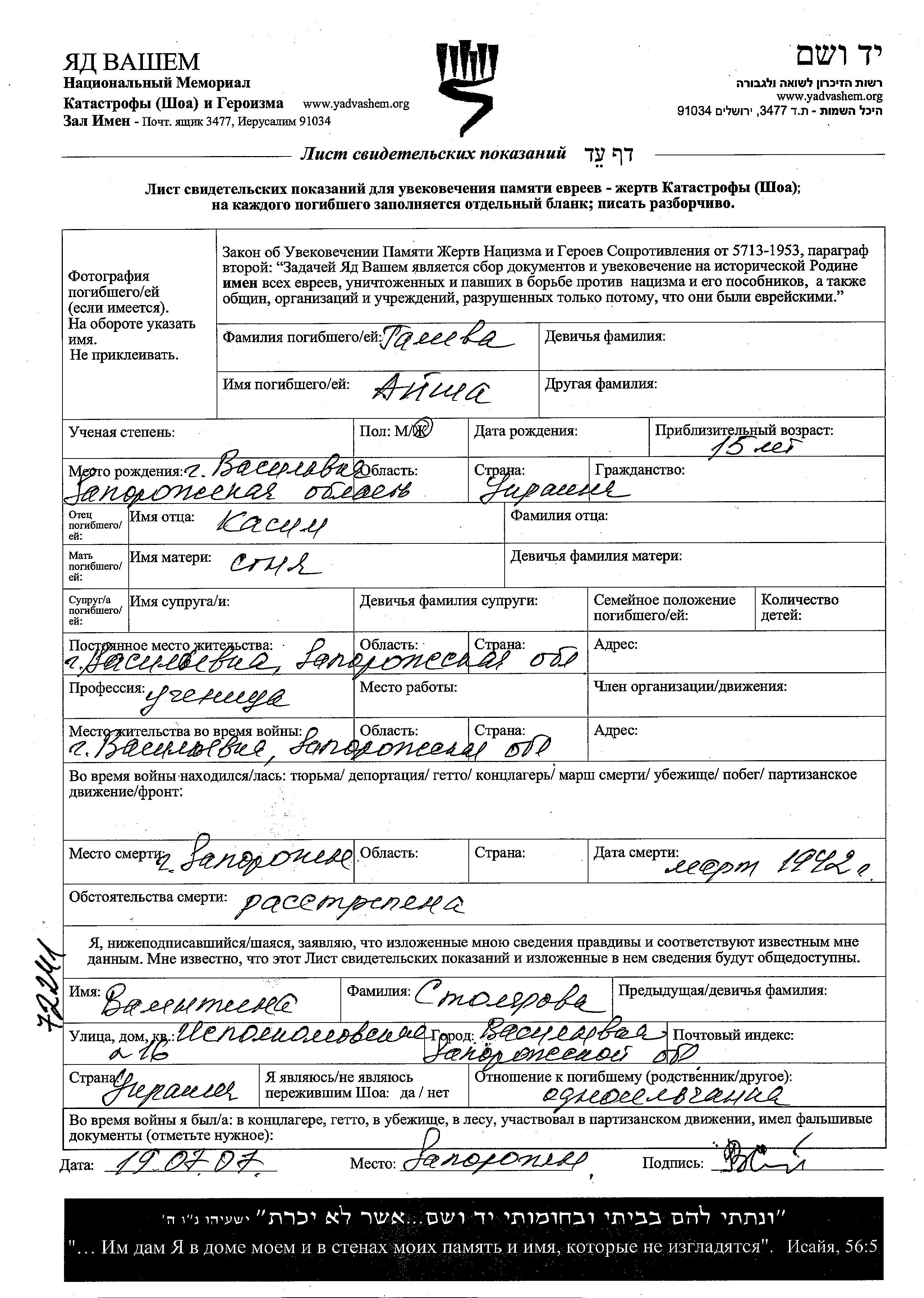 Yad Vashem - Pages of Testimony Names Memorial Collection