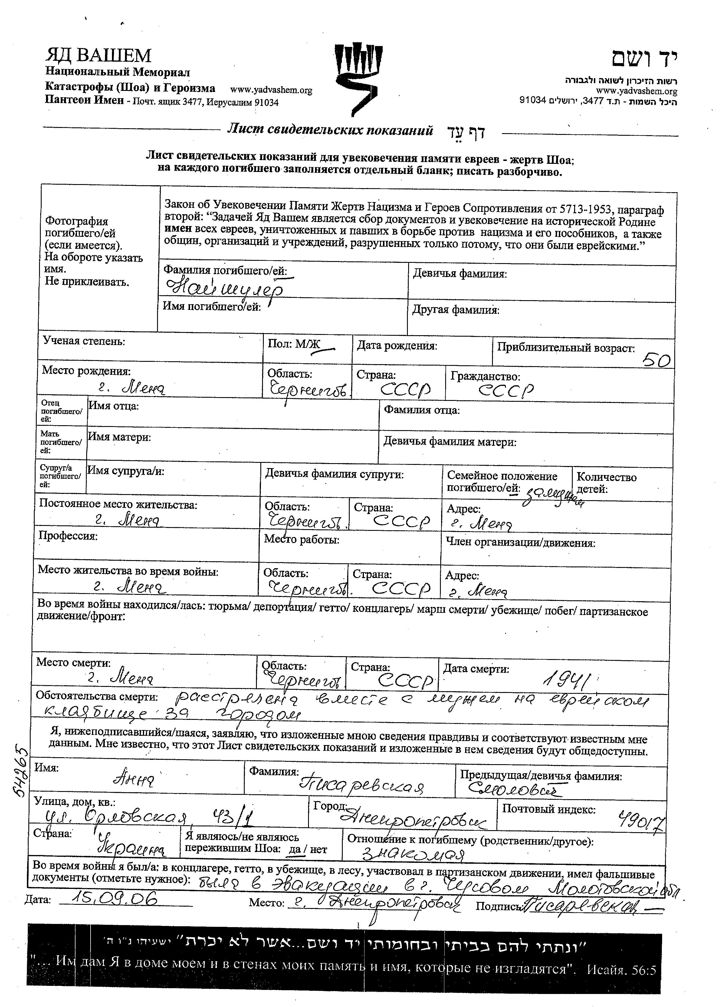 Naishuler First name unknown Mena, Ukraine (USSR) Page of Testimony
