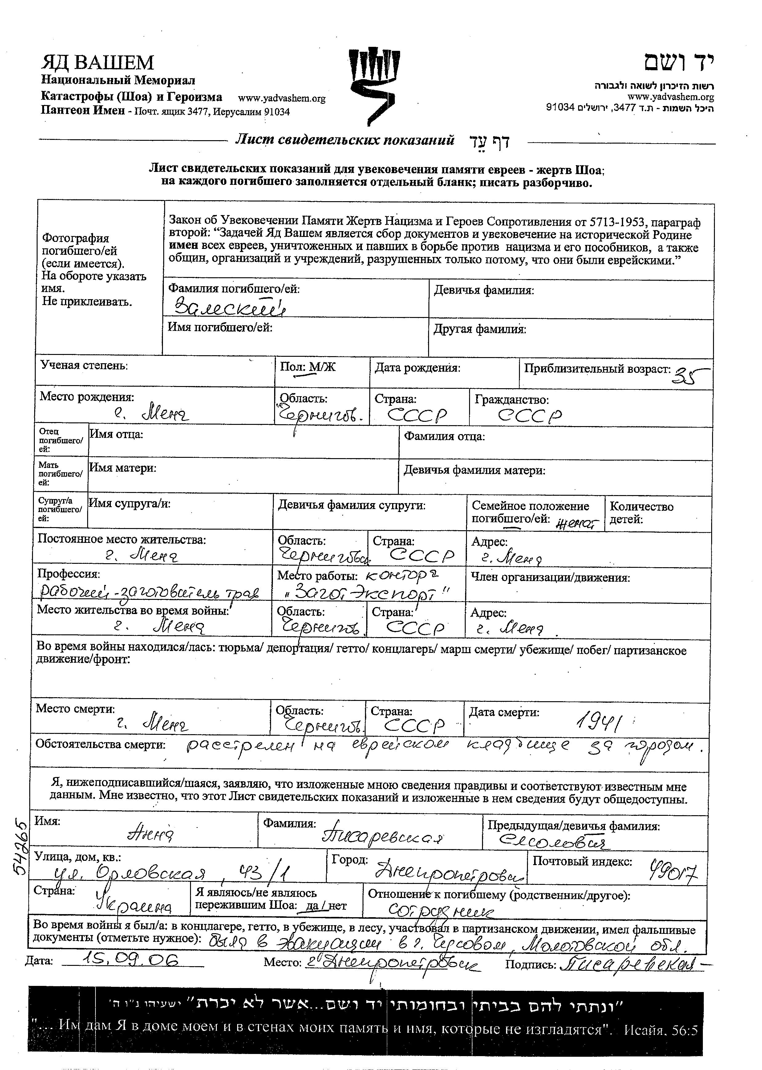 Zaleski First name unknown Mena, Ukraine (USSR) Page of Testimony