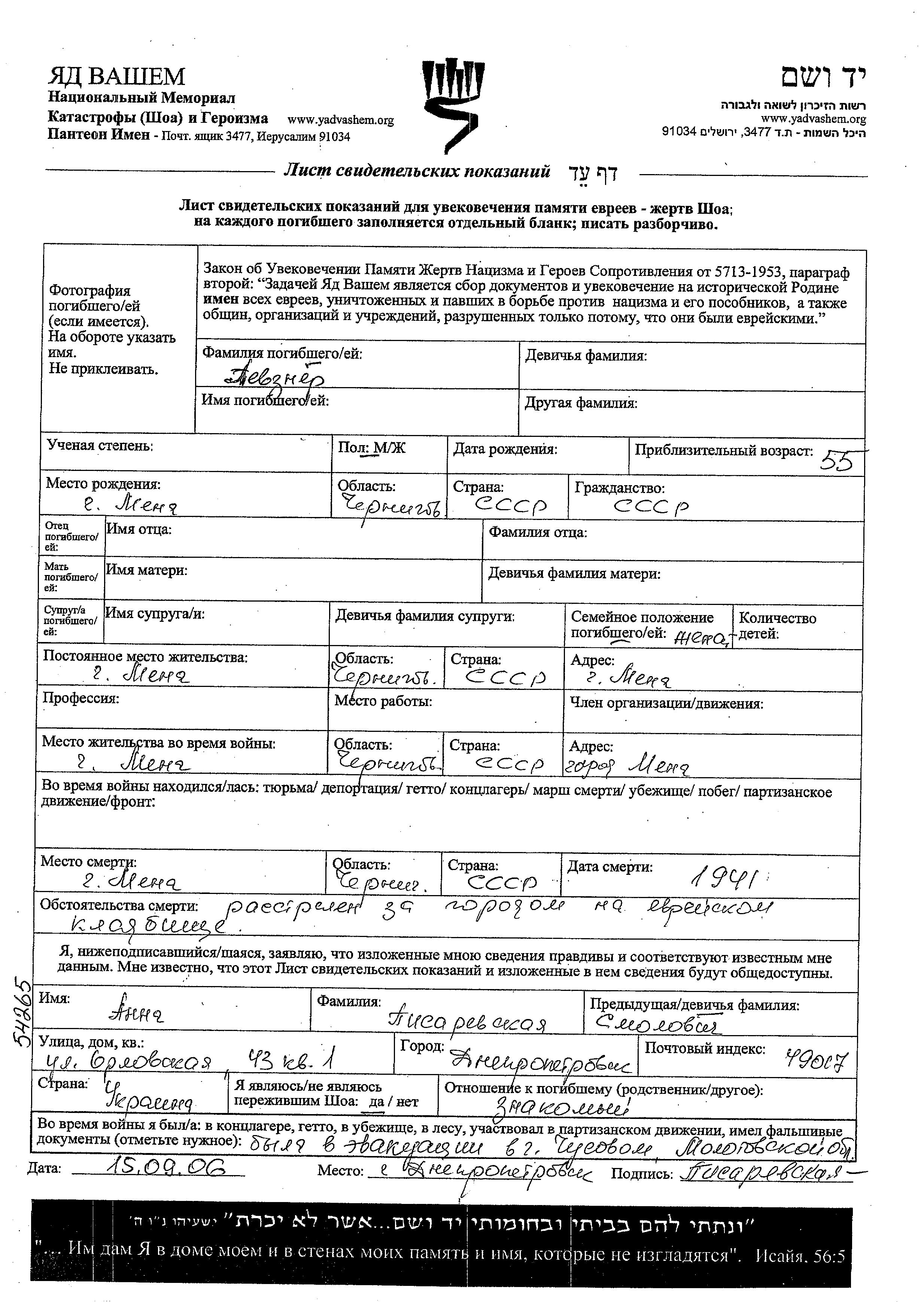 Pevzner First name unknown Mena, Ukraine (USSR) Page of Testimony