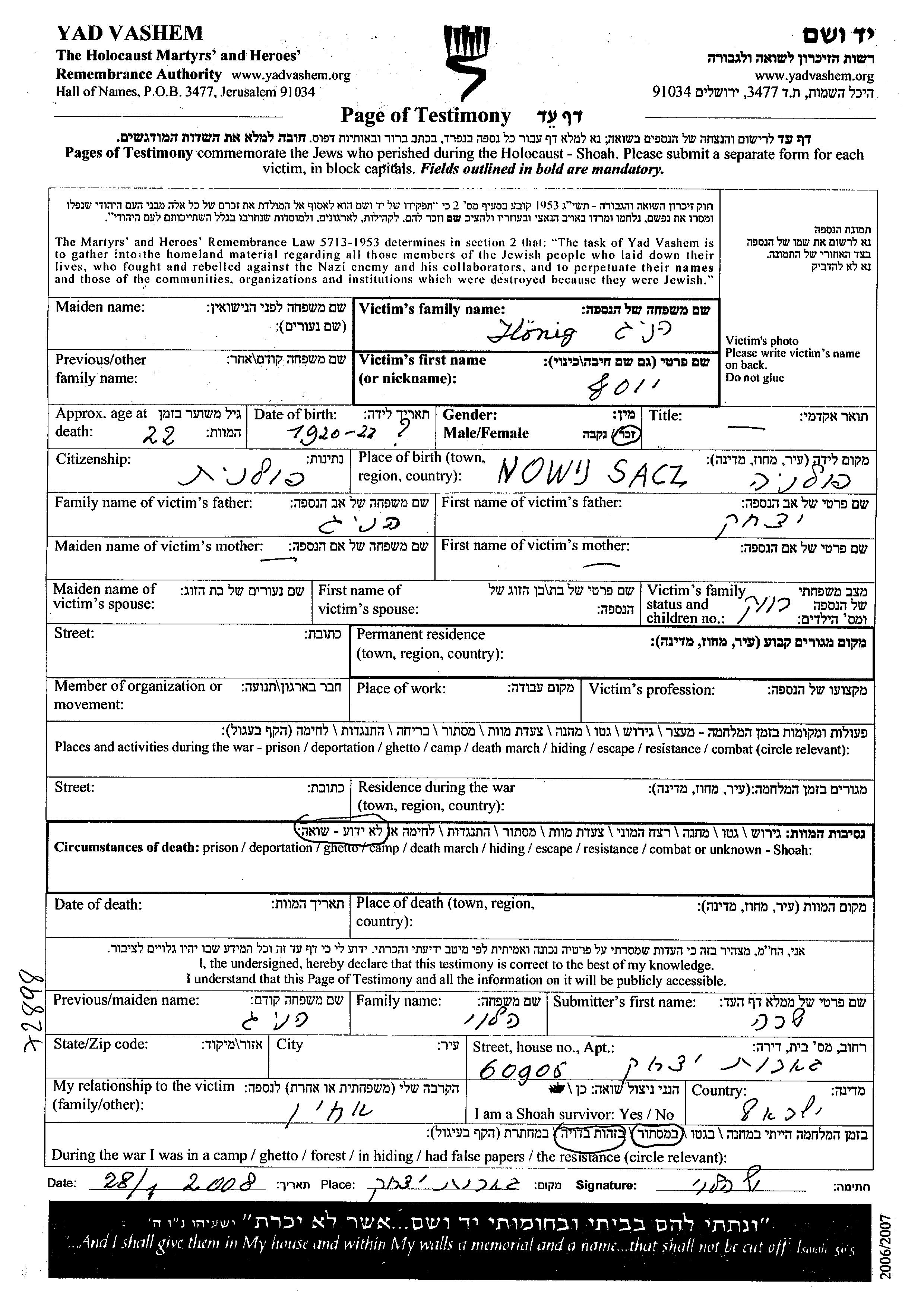 Yad Vashem - Pages of Testimony Names Memorial Collection