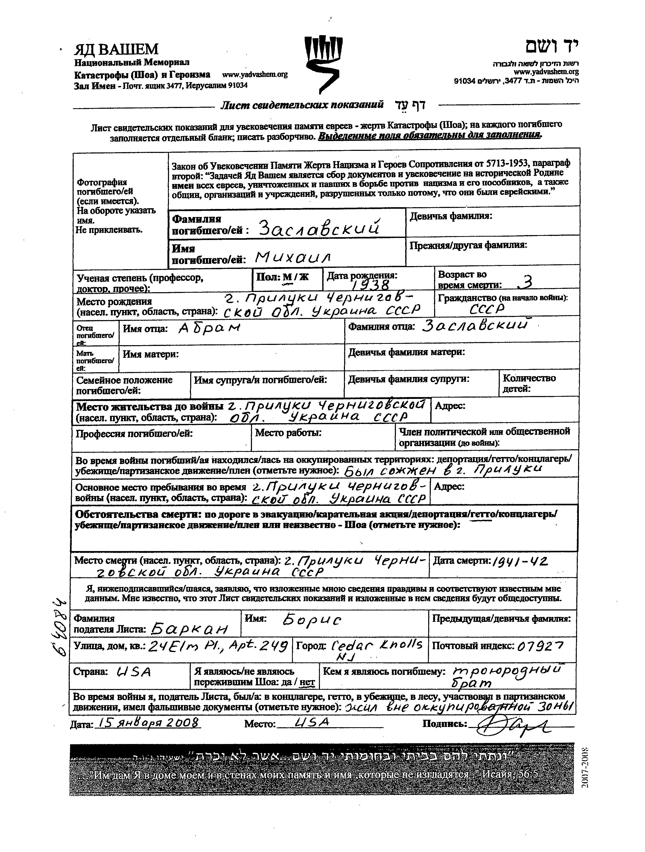 Zaslavski Mikhail 1938 Priluki, Ukraine (USSR) Page of Testimony
