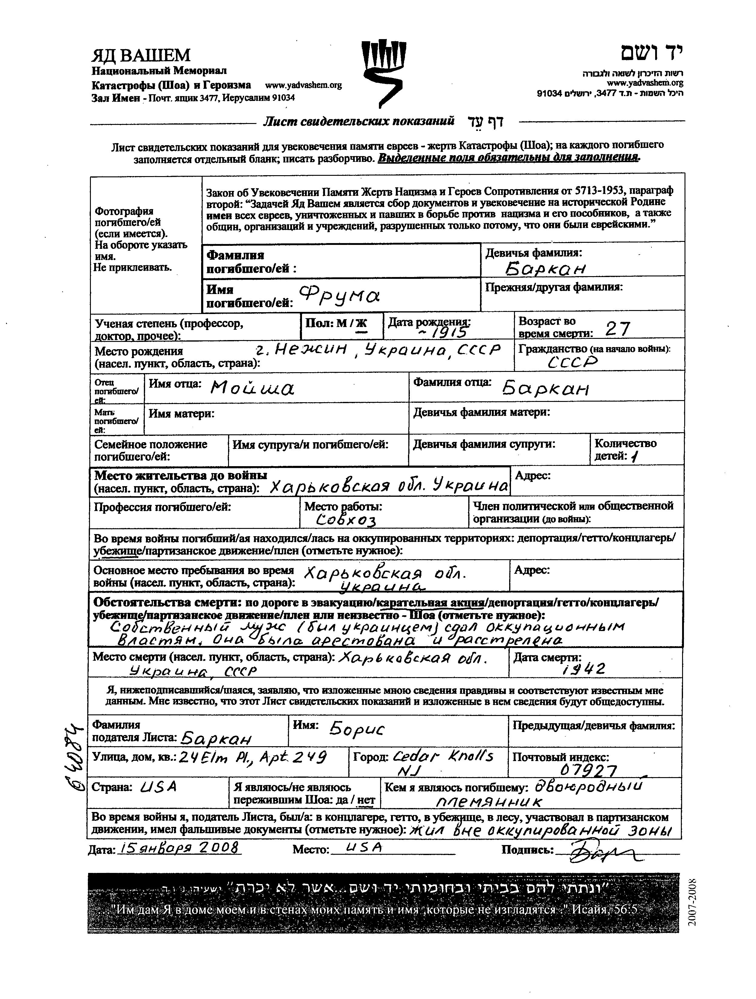 Fruma Surname unknown nee Barkan was born in Nezhin, Ukraine (USSR), 1915 to Moisha. She was married. Prior to WWII she lived in Kharkov, Ukraine (USSR). During the war she was in Kharkov, Ukraine (USSR).