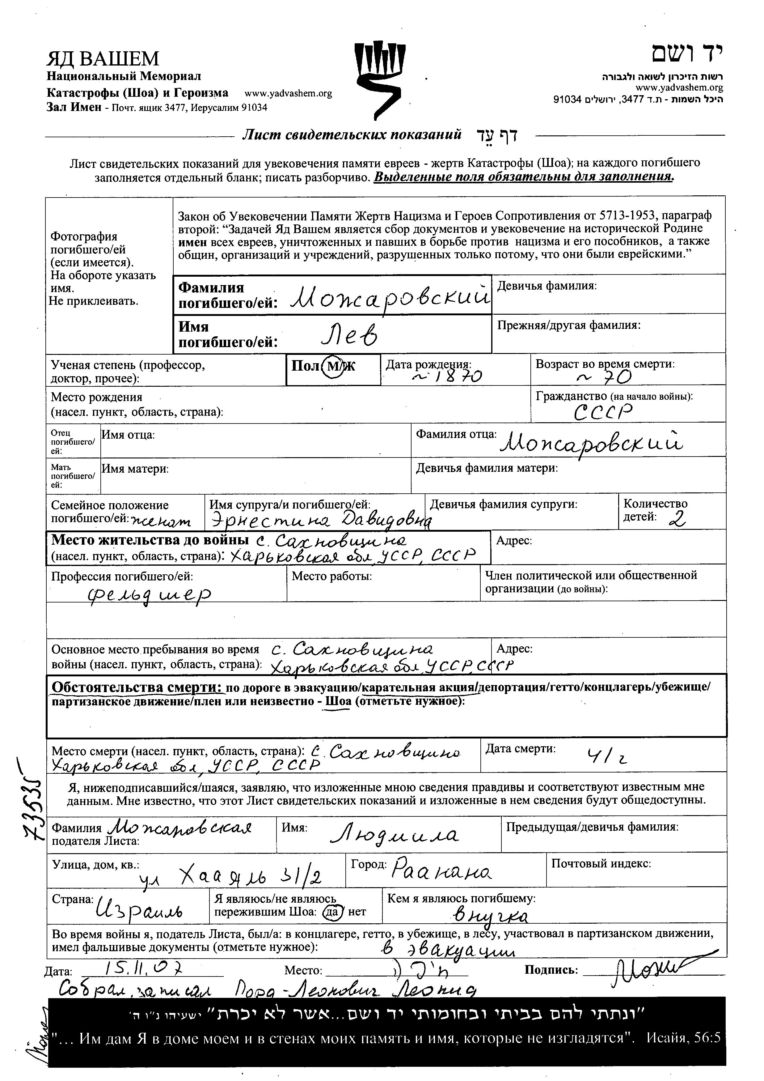 Lev Mozharovski was born, 1870. He was a paramedic and married to Ernestina. Prior to WWII he lived in Sakhnovshchina, Ukraine (USSR). During the war he was in Sakhnovshchina, Ukraine (USSR). Lev was murdered in the Shoah. Place of death: Sakhnovshchina, Ukraine (USSR), 1941.