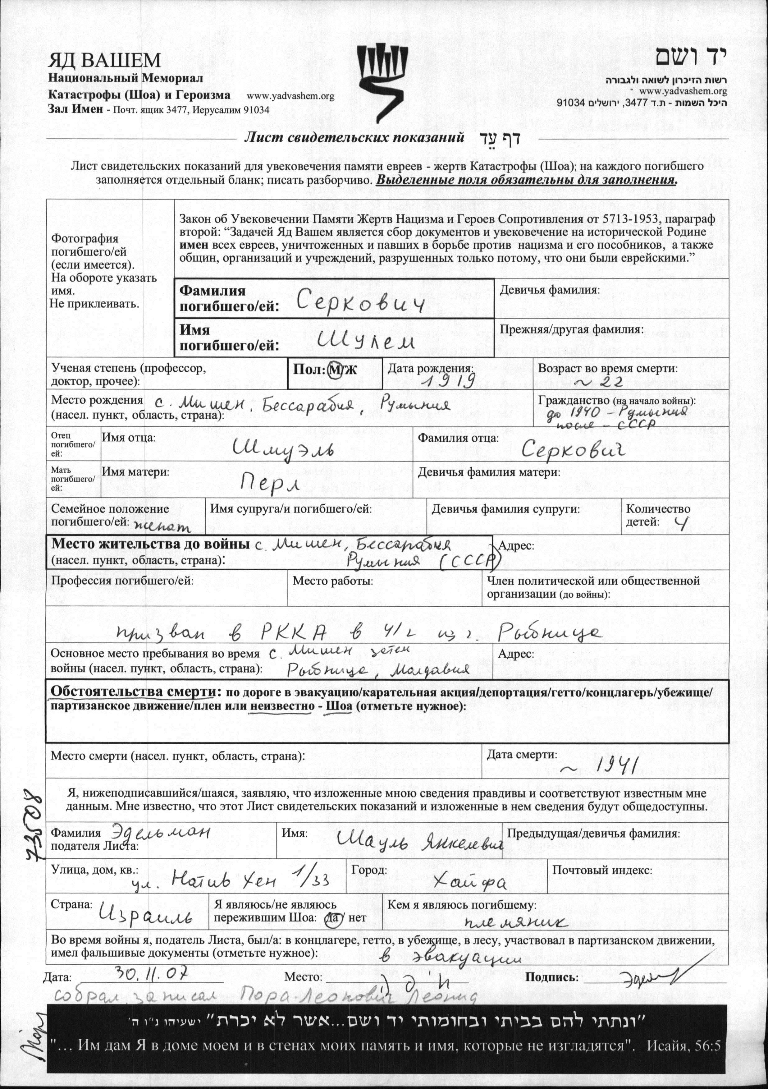 Shulem Serkovich was born in Misheny, Romania, 1919 to Shmuel and Perl. He was married. Prior to WWII he lived in Misheny, Romania. During the war he was in the Soviet armed forces. Shulem was killed in military service in WWII. Place of death: unknown, 1941.