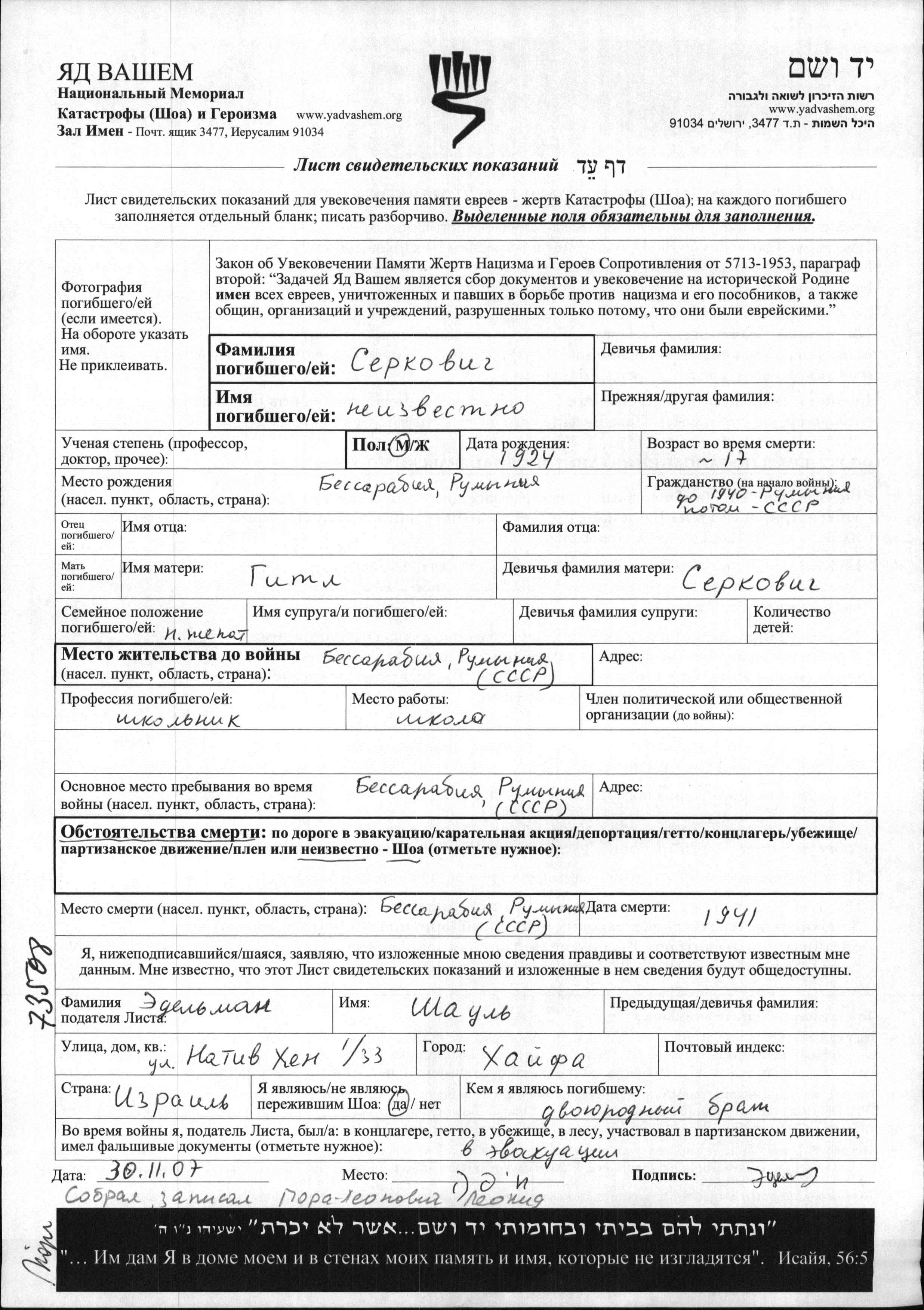 First name unknown Serkovich was born in Bessarabia, Romania, 1924 to Gitl. He was a schoolboy and teenager. Prior to WWII he lived in Bessarabia, Romania. During the war he was in Bessarabia, Romania.