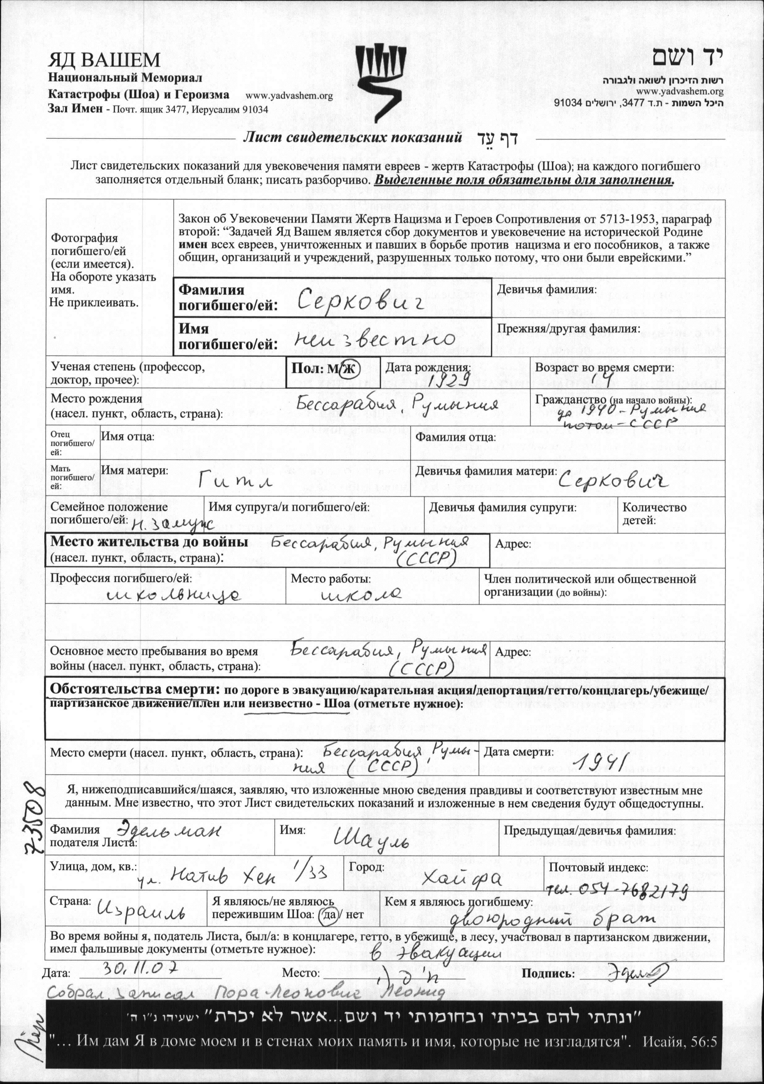 Serkovich First name unknown 1929 Romania Page of Testimony