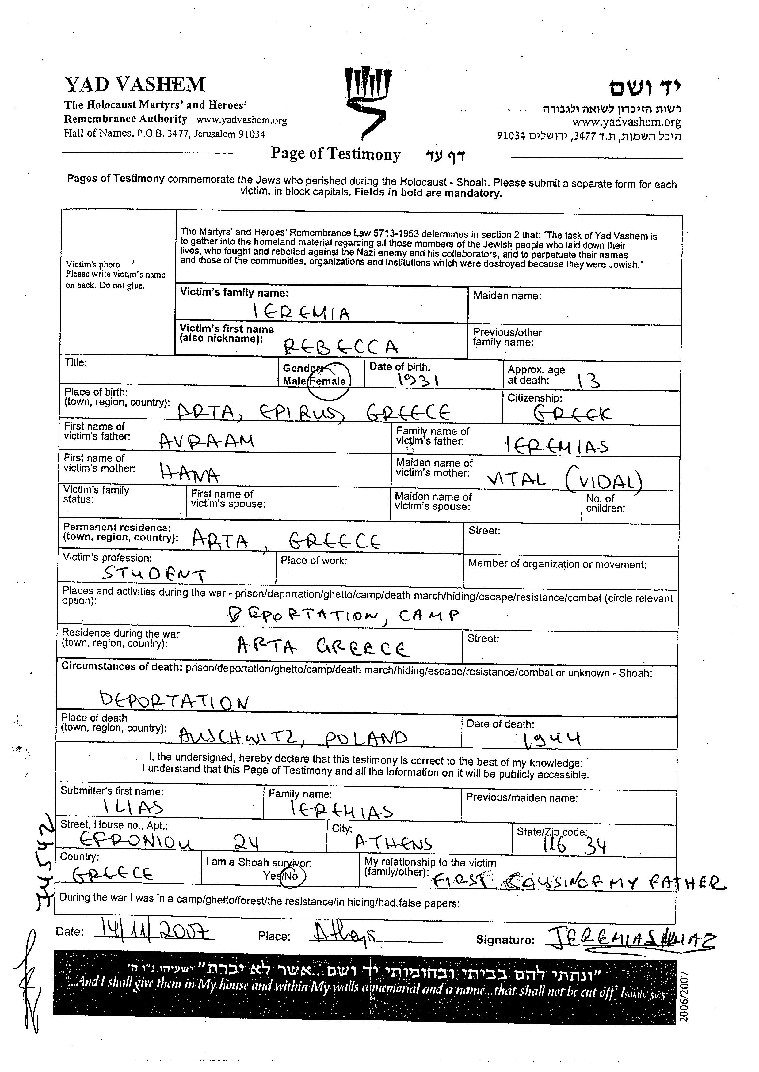Ieremia Rebecca 1931 Arta, Greece Page of Testimony