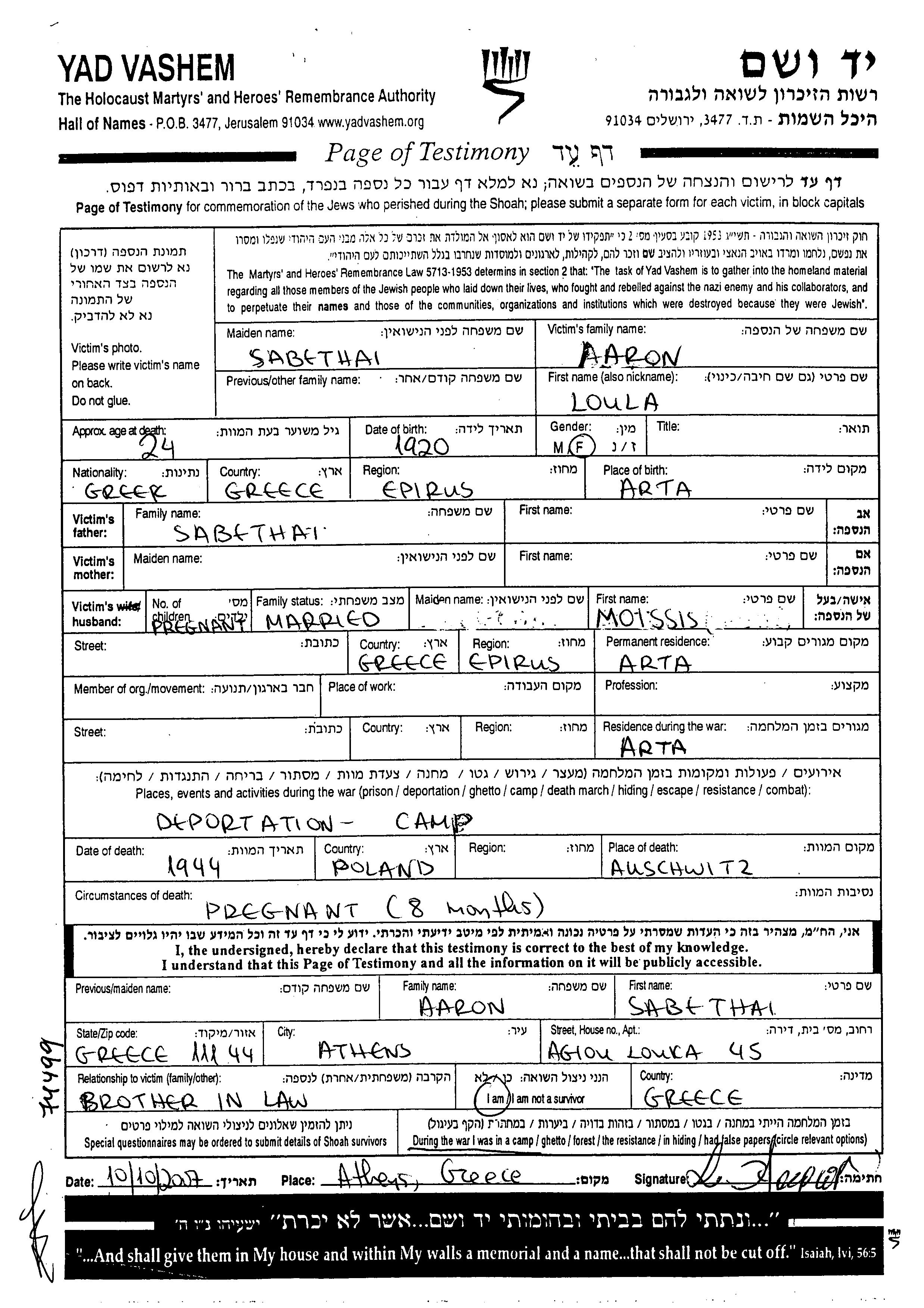 Aaron Loula 1920 Arta, Greece Page of Testimony