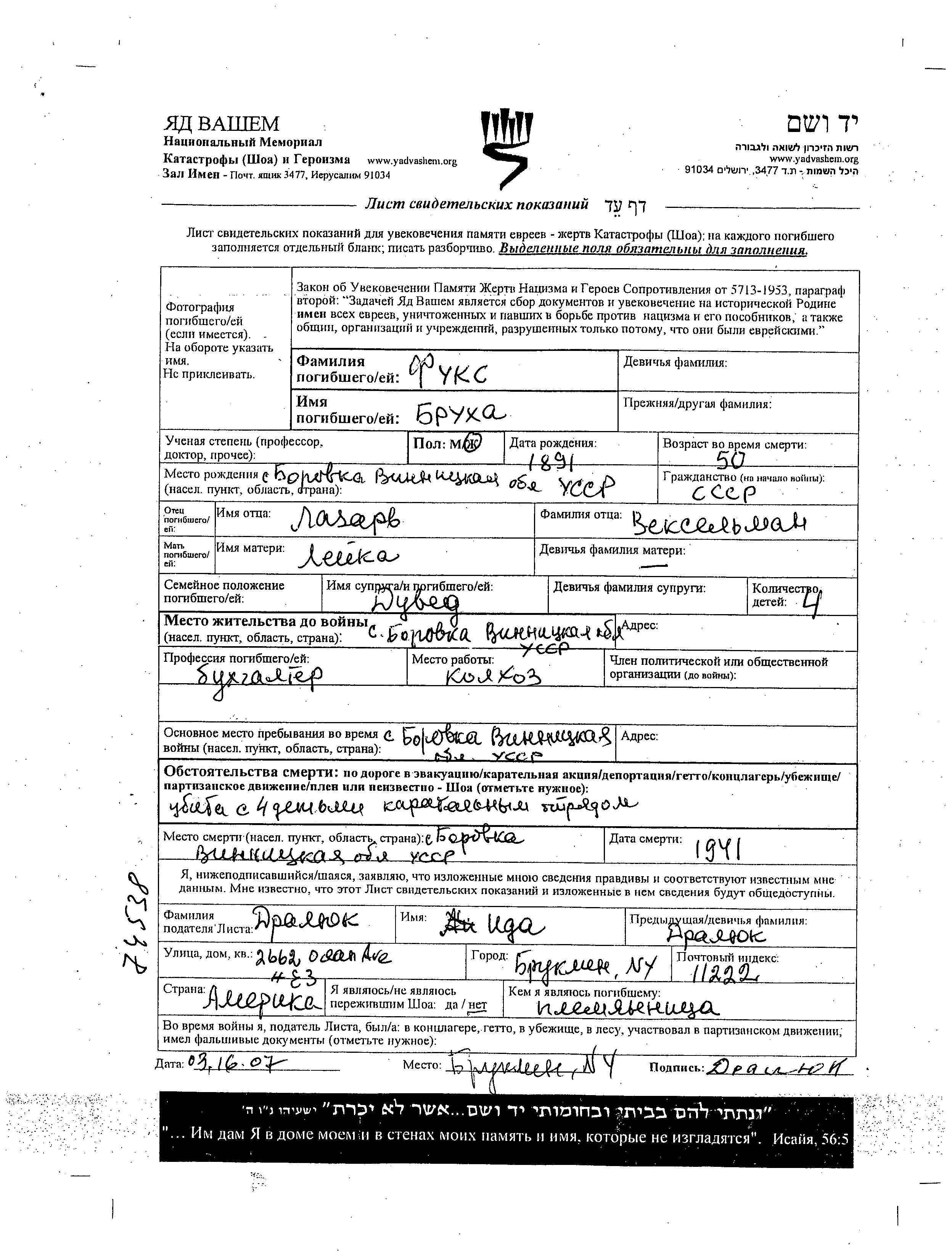Brukha Fuks was born in Borovka, Ukraine (USSR), 1891 to Lazar and Leika. She was a bookkeeper and married to Duved. Prior to WWII she lived in Borovka, Ukraine (USSR). During the war she was in Borovka, Ukraine (USSR). Brukha was murdered in the Shoah. Place of death: Borovka, Ukraine (USSR), 1941.