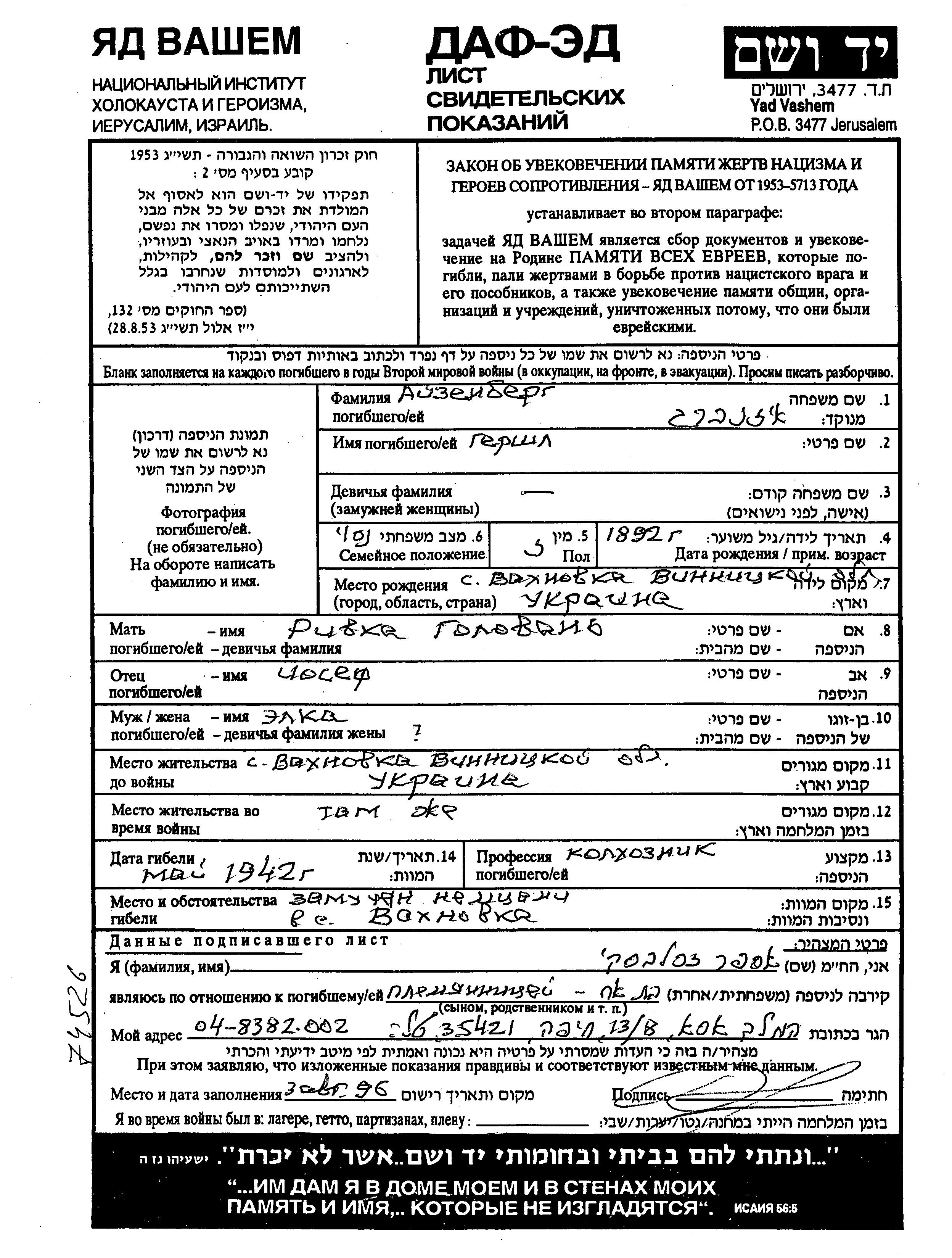 Aizenberg Gershl 1892 Vakhnovka, Ukraine (USSR) Page of Testimony